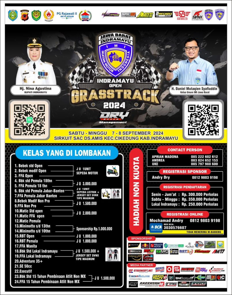 Untuk informasi lebih lanjut tentang pendaftaran dan informasi seputar gelaran Indramayu Open Grasstrack 2024 bisa langsung menghubungi kontak yang tertera pada flyer. So, mumpung ada waktu buruan daftar sebelum kuota kehabisan.