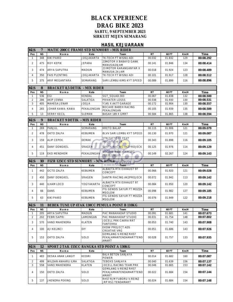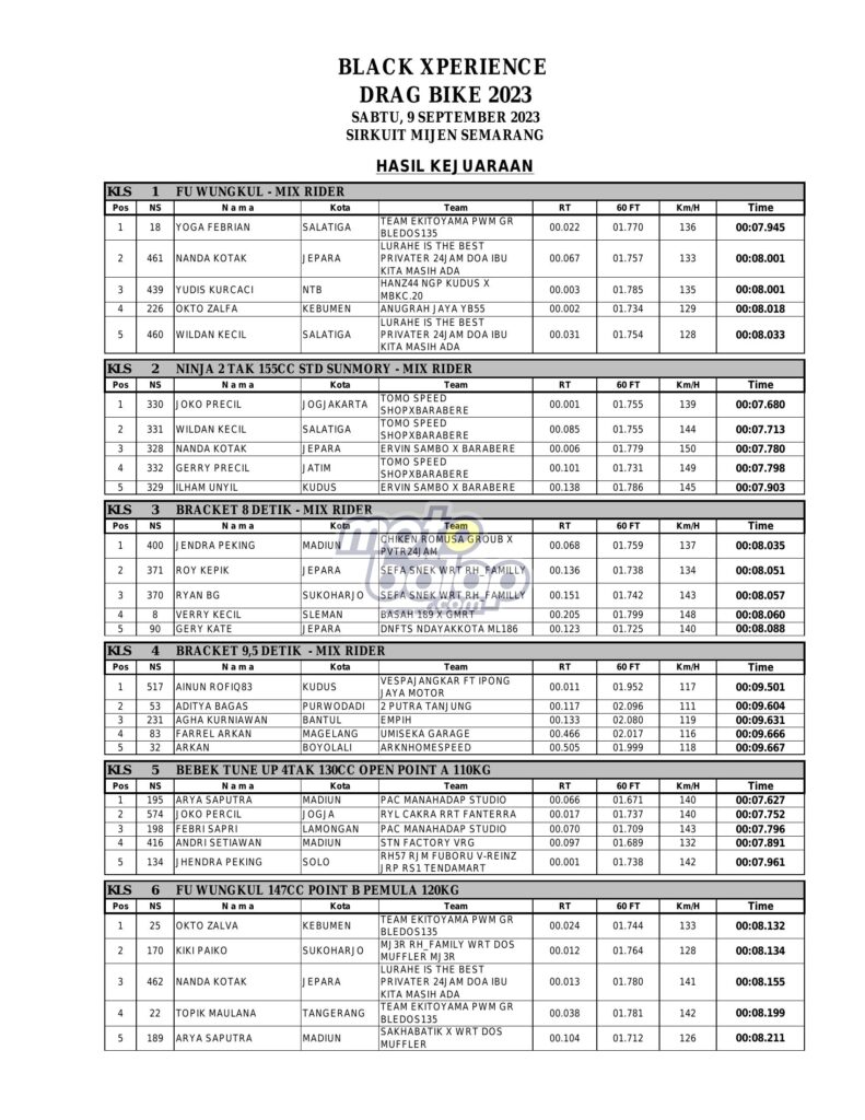Dari keselurahan kelas yang dilombakan, di bawah ini merupakan Daftar Juara Black Drag Bike Seri 2 Mijen adalah sebagai berikut: