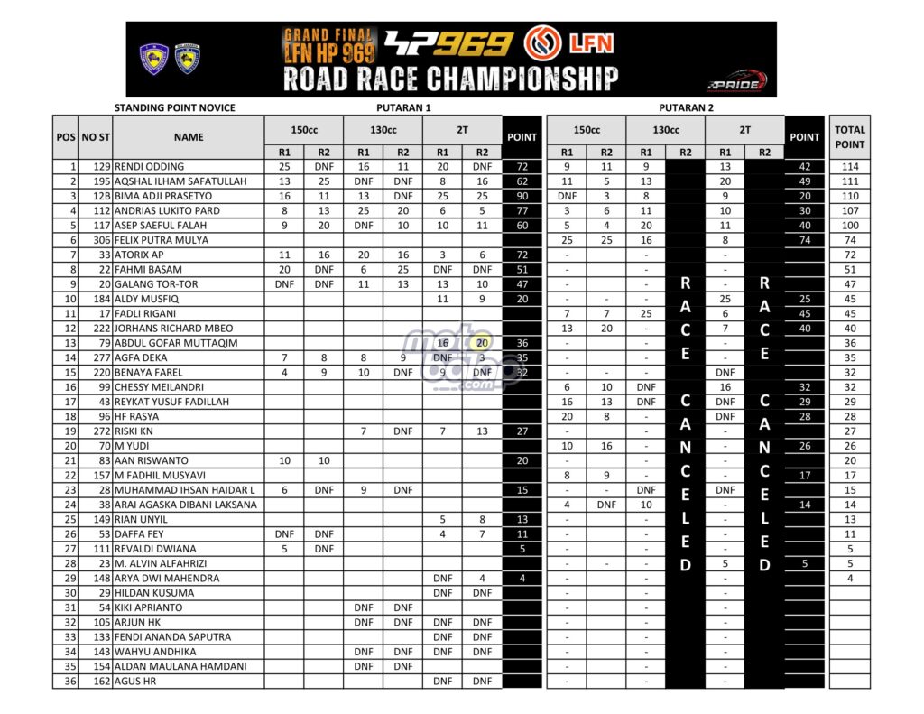 Dari keselurahan kelas yang dilombakan, di bawah ini merupakan Total Point Keseluruhan LFN HP 969 Road Race Championship 2023 adalah sebagai berikut: