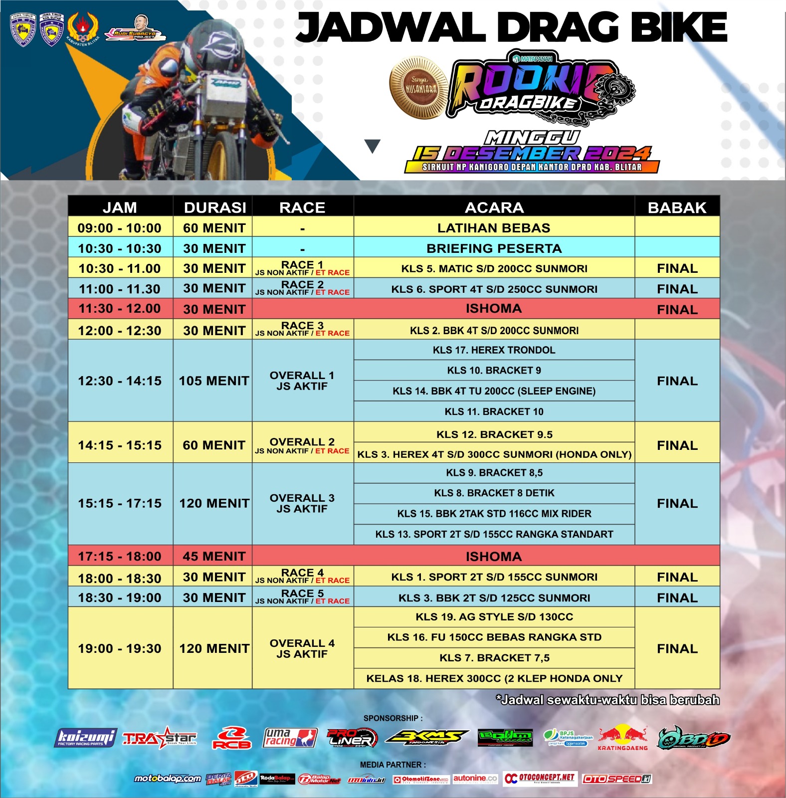 • Penampilan Pembalap Rookie Drag Bike: balapan ini akan diikuti oleh pembalap rookie unggulan dari Jawa Timur dan sekitarnya.