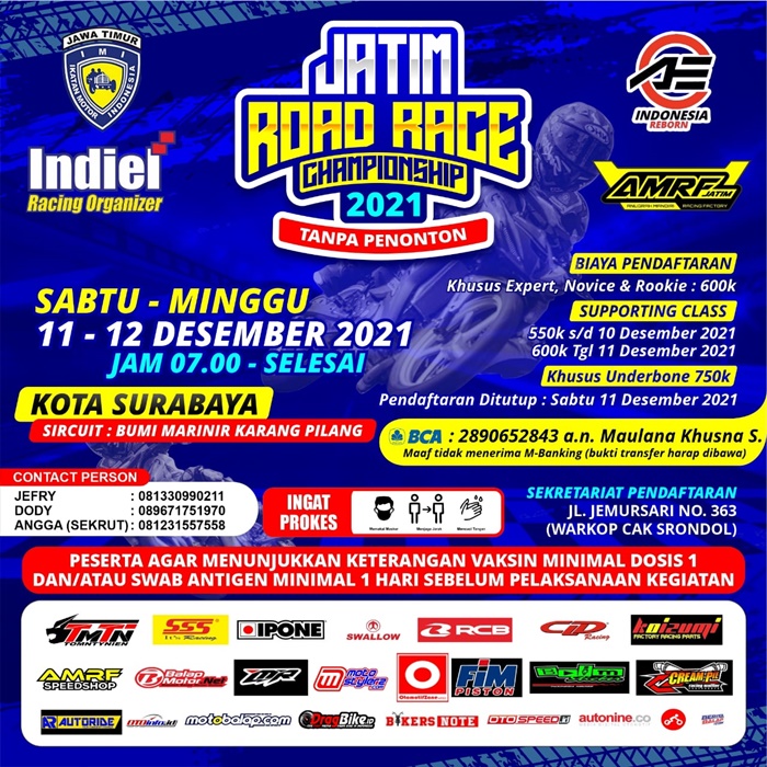 JATIM Road Race Championship Siap di Gelar 11-12 Desember 2021 Dengan Terobosan Baru. Apa Saja MOTOBALAP.COM – Gairah olahraga balap motor roda dua di Jawa Timur kembali aktif pasalnya, dalam waktu dekat gelaran Jatim Road Race Championship bakal tersaji dengan konsep dan kemasan acara yang berbeda dari sebelumnya yang siap dihelat di sirkuit non permanen Bumi Marinir Karang Pilang, Surabaya, Jawa Timur 11-12 Desember 2021.