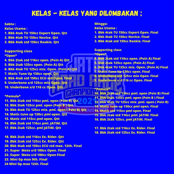 Untuk kita ketahui bersama, pihak panitia telah membuka pendaftaran dan infomasi lebih lengkap bisa di lihat pada poster yang terterah di bawah. Segera siapkan motor balap kalian dan jadilah juara untuk menambah gelar juara di akhir tahun ini.