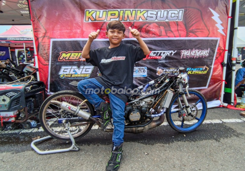 MOTOBALAP.com – Rizky Unyil, joki belia yang masih duduk di bangku kelas 4 SDN 1 Geongan Arjawinangun, Cirebon, yang membela tim Kubu Mawar X LGM SYR berhasil meriah fastest 6,958 detik di kelas Sport 2T 155cc TU Rookies pada gelaran Super Indonesia Drag (SID) Dragbike Championship 2025 Round 1 yang berlangsung di Meikarta Speedway, Bekasi, Minggu (04/5).