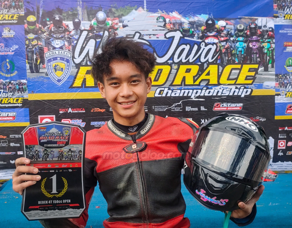 Yup, hal ini dibuktikan pada gelaran West Java Roadrace Championship 2024 yang berlangsung disirkuit NP Brigif 15 Kujang II Cimahi 23 November 2025, kemarin. Rajo Satria yang masih duduk dikelas 12 SMAN 3 Sumedang ini sanggup menjadi juara dikelas Bebek 4T 150cc TU Mix Rider yang dihuni para pembalap senior bersama tim 112 Garage Kataji Racing team KRZ 117.