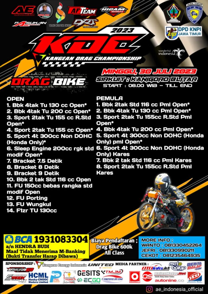 “Selamat bertanding lagi dalam satu ajang drag bike terbaik saat ini. Akhir pekan nanti, kami akan hadir serta menyuguhkan satu event balap lurus 201 meter dengan sajian yang menarik. Tentunya akan membuat semua pengemar dragbike akan terhibur dan dapat menyalurkan minat dan bakat di KDC 2023 Blitar,” buka Budi AF Team, selaku penyelenggara Kangean Drag Championship 2023.