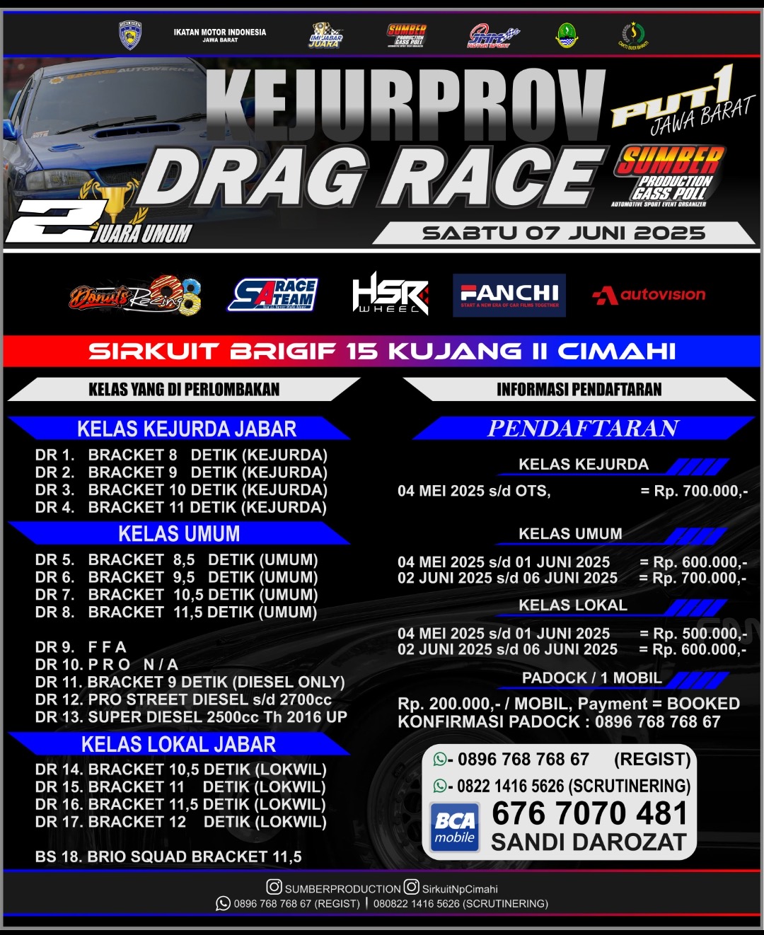 MOTOBALAP.com – Sirkuit Brigif 15 Kujang II Cimahi akan menjadi tuan rumah gelaran Kejurprov Jabar Drag Race 2025 Putaran 1 yang akan dihelat pada Sabtu, 7 Juni weekend ini. Ajang balap mobil ini merupakan kolaborasi IMI Pengprov Jabar dengan Sumber Production sebagai promotor dengan segudang pengalaman di otomotif.