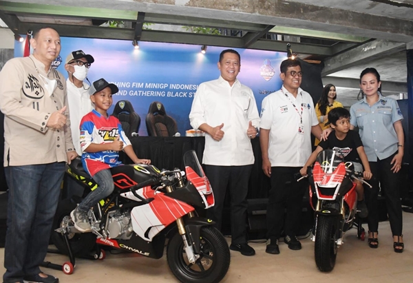 MOTOBALAP.COM, Jakarta – Ketua MPR RI sekaligus Ketua Umum Ikatan Motor Indonesia (IMI) Bambang Soesatyo bersama Wakil Ketua Umum Internasional dan Event Happy Harinto, Ketua IMI DKI Jakarta Anondo Eko, Komisaris Sport Talenta Indonesia Rani, serta Direktur PT Bekarya Otomotif Sukses Djoko Iman Santoso secara resmi melakukan kick off penyelenggaraan FIM MiniGP Indonesia Series 2022 – Road to MotoGP, sebagai bagian dari FIM MiniGP World Series 2022 yang diselenggarakan secara global oleh Fédération Internationale de Motocyclisme (FIM) dan Dorna Sports.