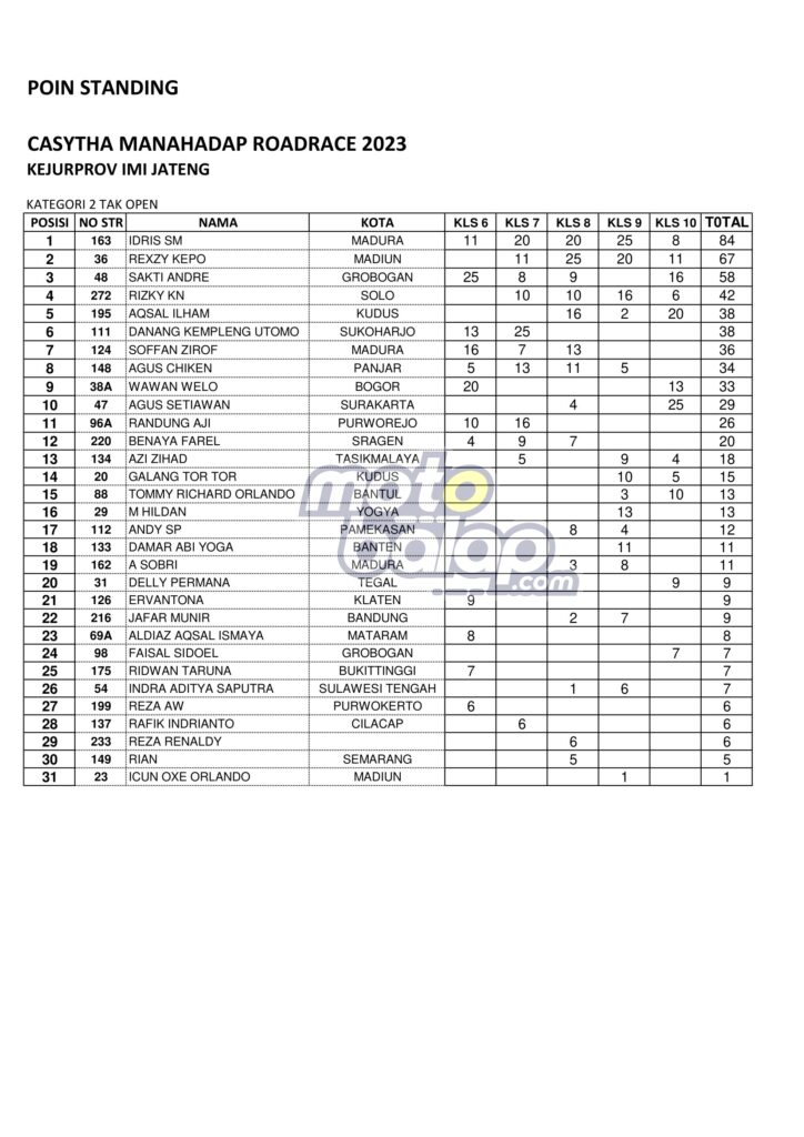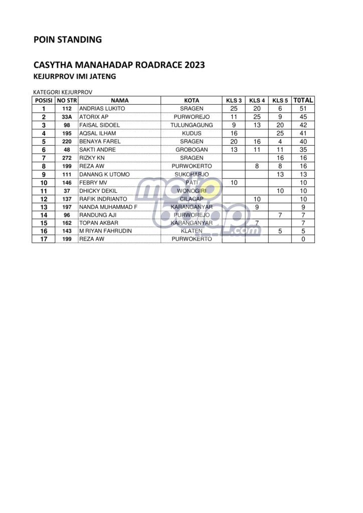 Dari kesulurahn kelas yang dilombakan, di bawah ini merupakan Klasemen Kejurprov Jateng Casytha Manahadap Road Race 2023 Putaran 1 Wonogiri adalah sebagai berikut: