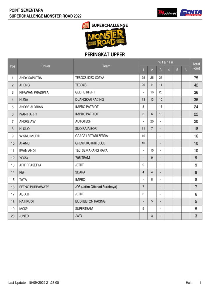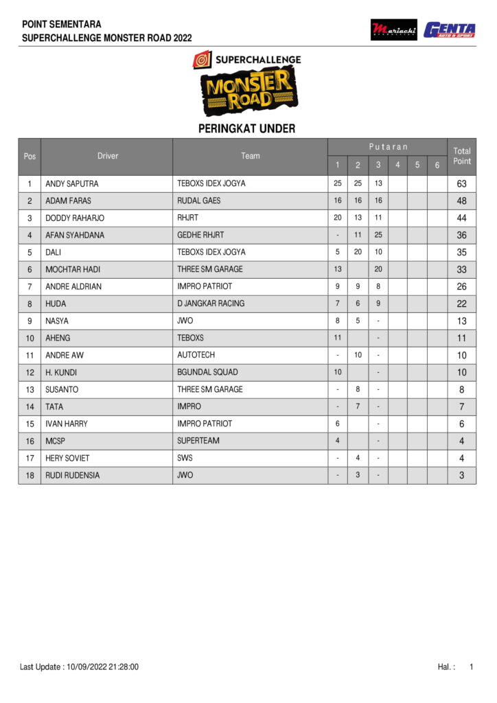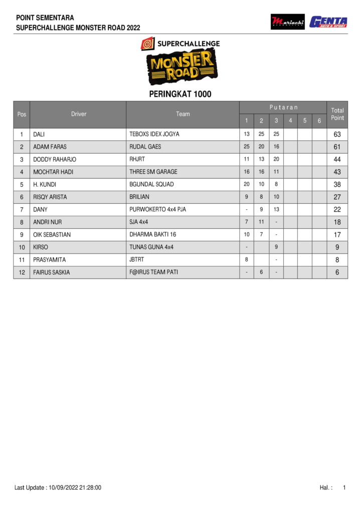 Berikut merupakah Klasemen Sementara SUPERCHALLENGE MONSTER ROAD 2022 adalah sebagai berikut: [DNG]
