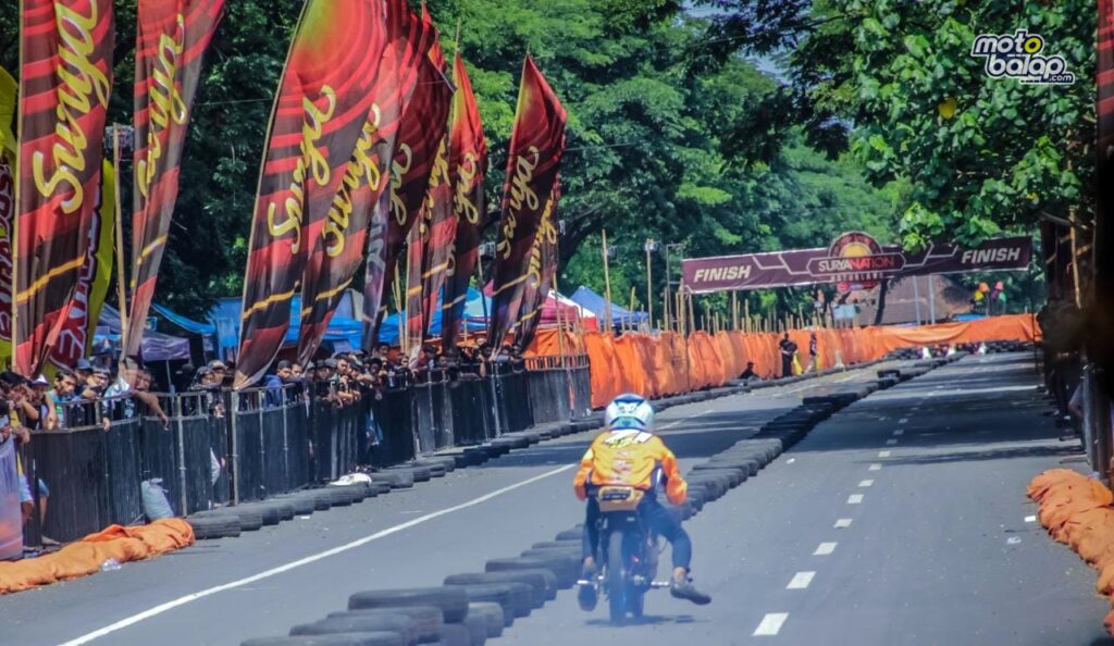 Benar sekali, branding event yang di buat pun sangat ketara. Kental dengan saji’an apik yang terlihat mulai di pintu masuk peddock hingga gapura start yang tertata rapi, lengkap dengan tambahan branding dari beberapa sponsor pendukung yang lainnya.