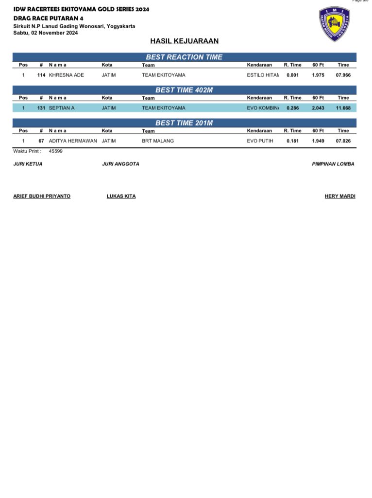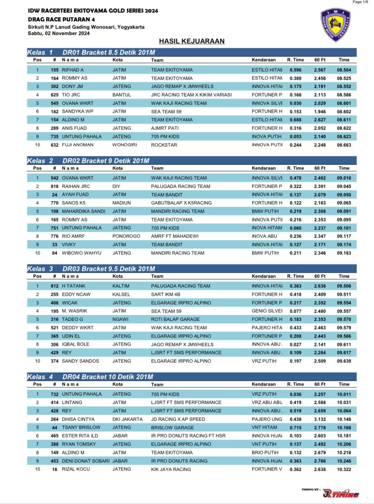 Dari keseluruhan kelas yang dilombakan, di bawah ini merupakan hasil Drag Race IDW putaran 4 sebagai berikut: