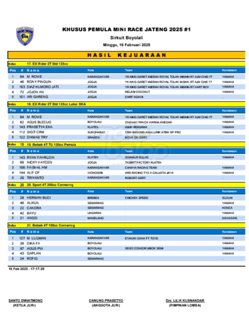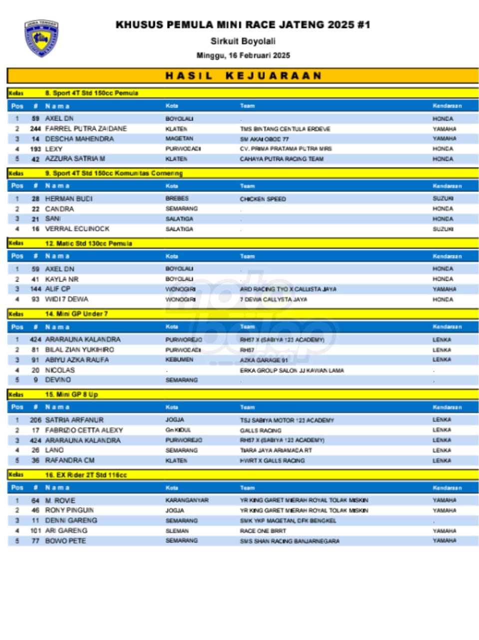 Dari seluruh kelas yang dilombakan, Lihat hasil IMI Jateng Mini Race Championship 2025 Boyolali adalah sebagai berikut: