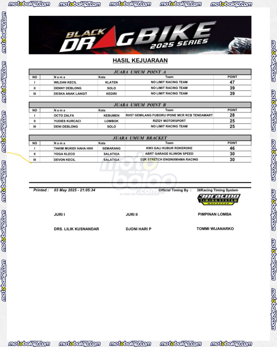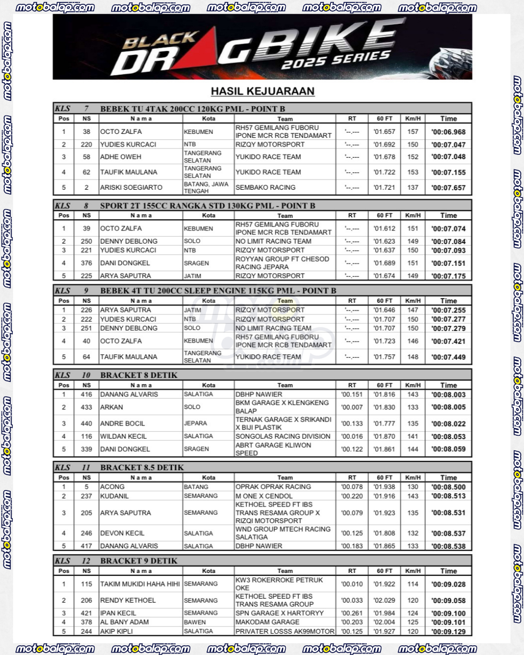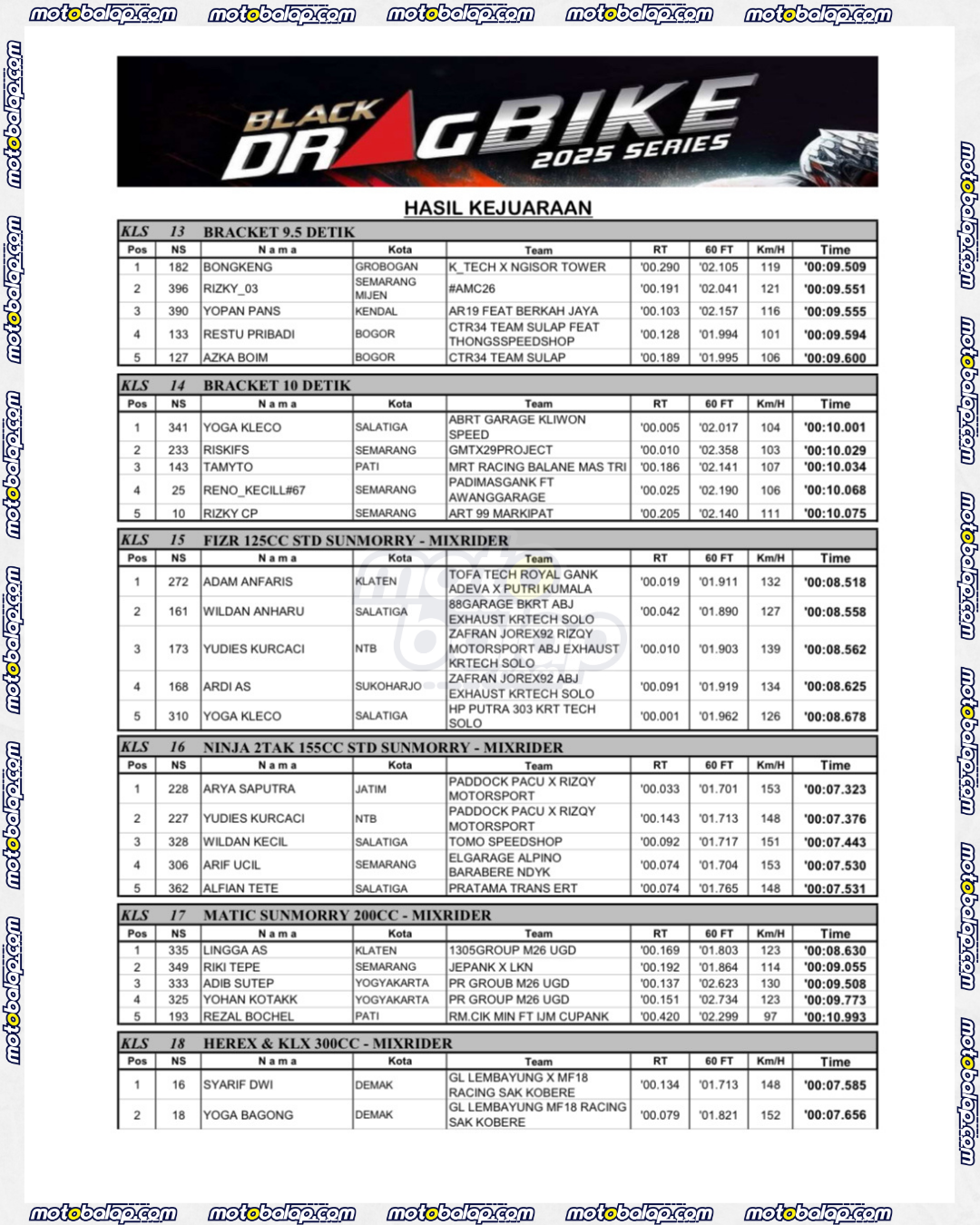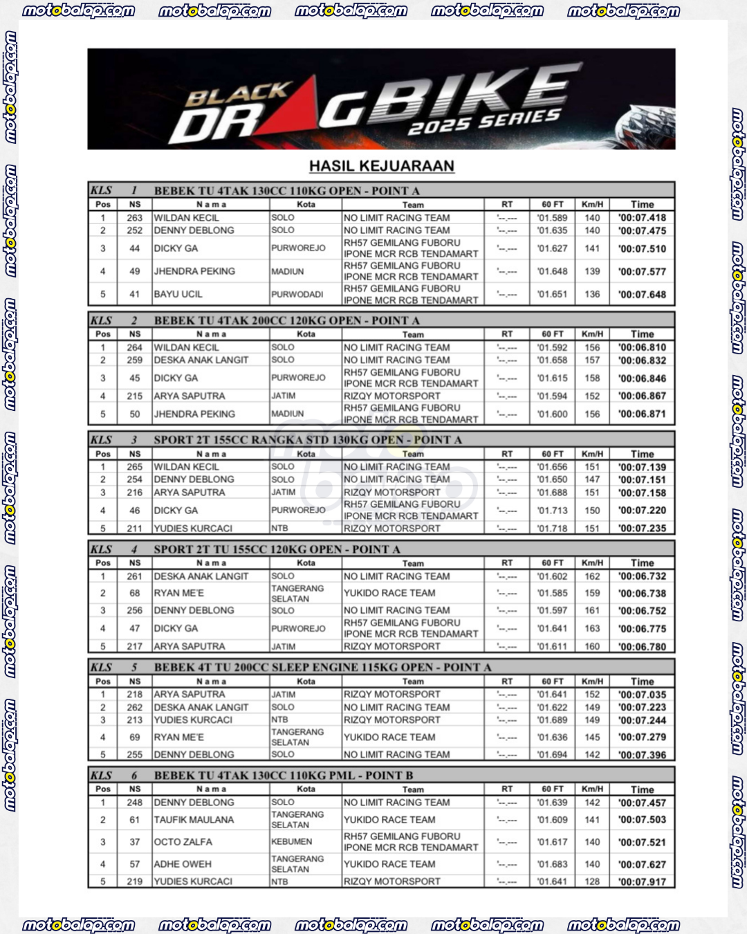 Dari seluruh kelas yang dilombakan, Lihat Hasil Kejuaraan Black Drag Bike 2025 Series Semarang adalah sebagai berikut:
