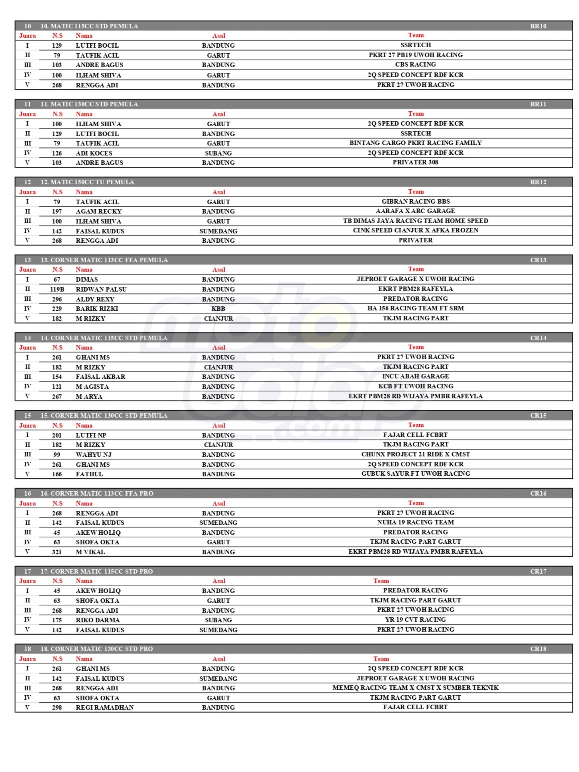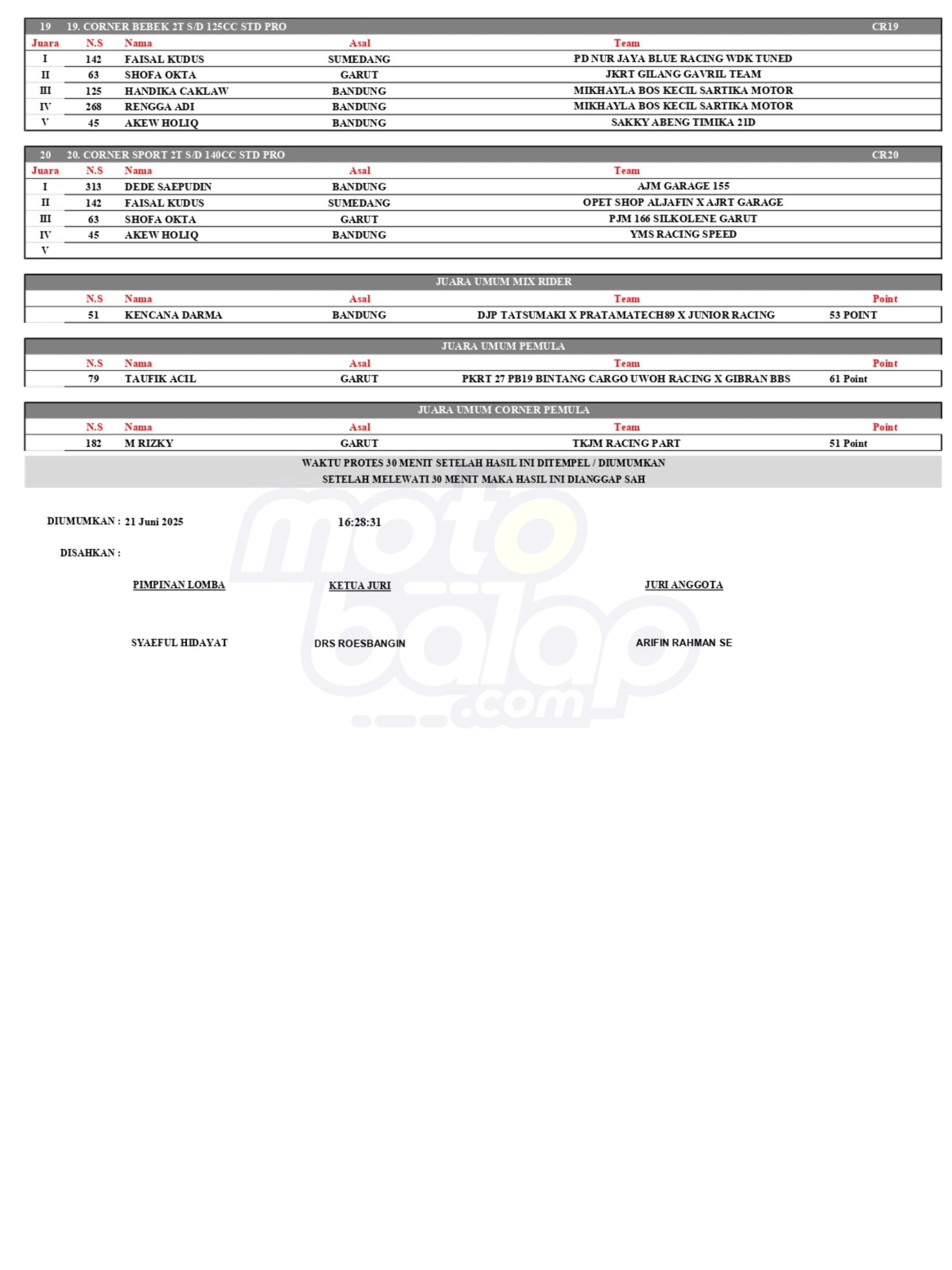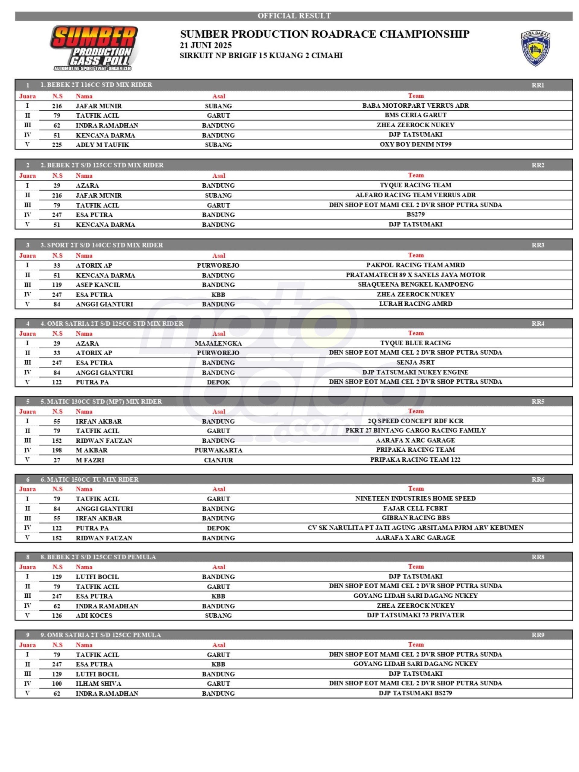 Dari keseluruhan kelas yang dilombakan, Lihat Hasil Lomba Kejuaraan Sumber Production Road Race Championship 2025 adalah sebagai berikut: