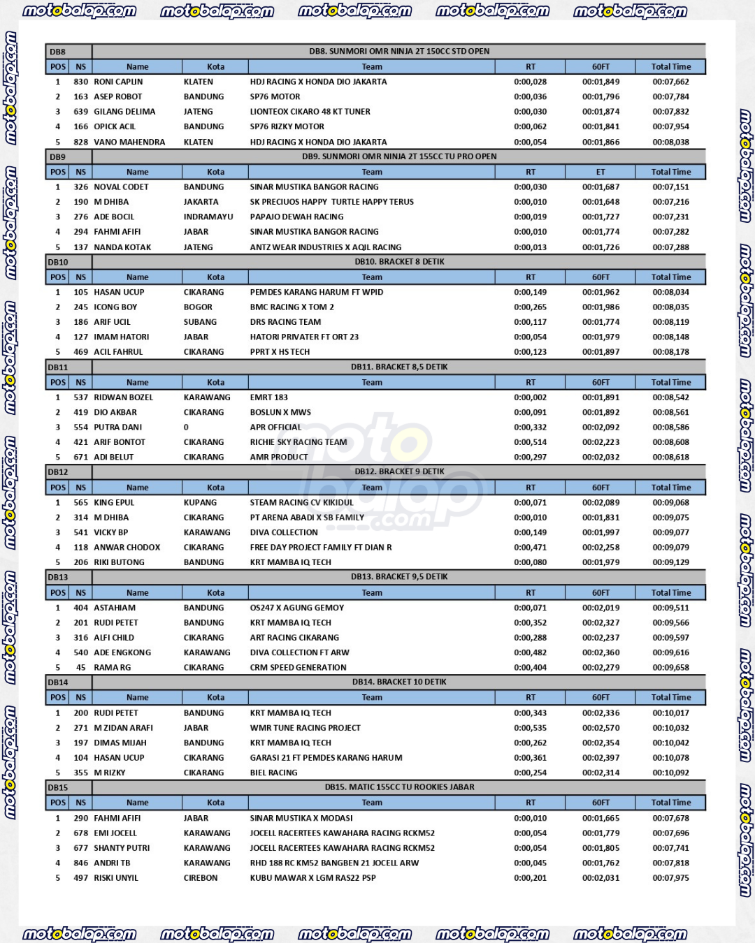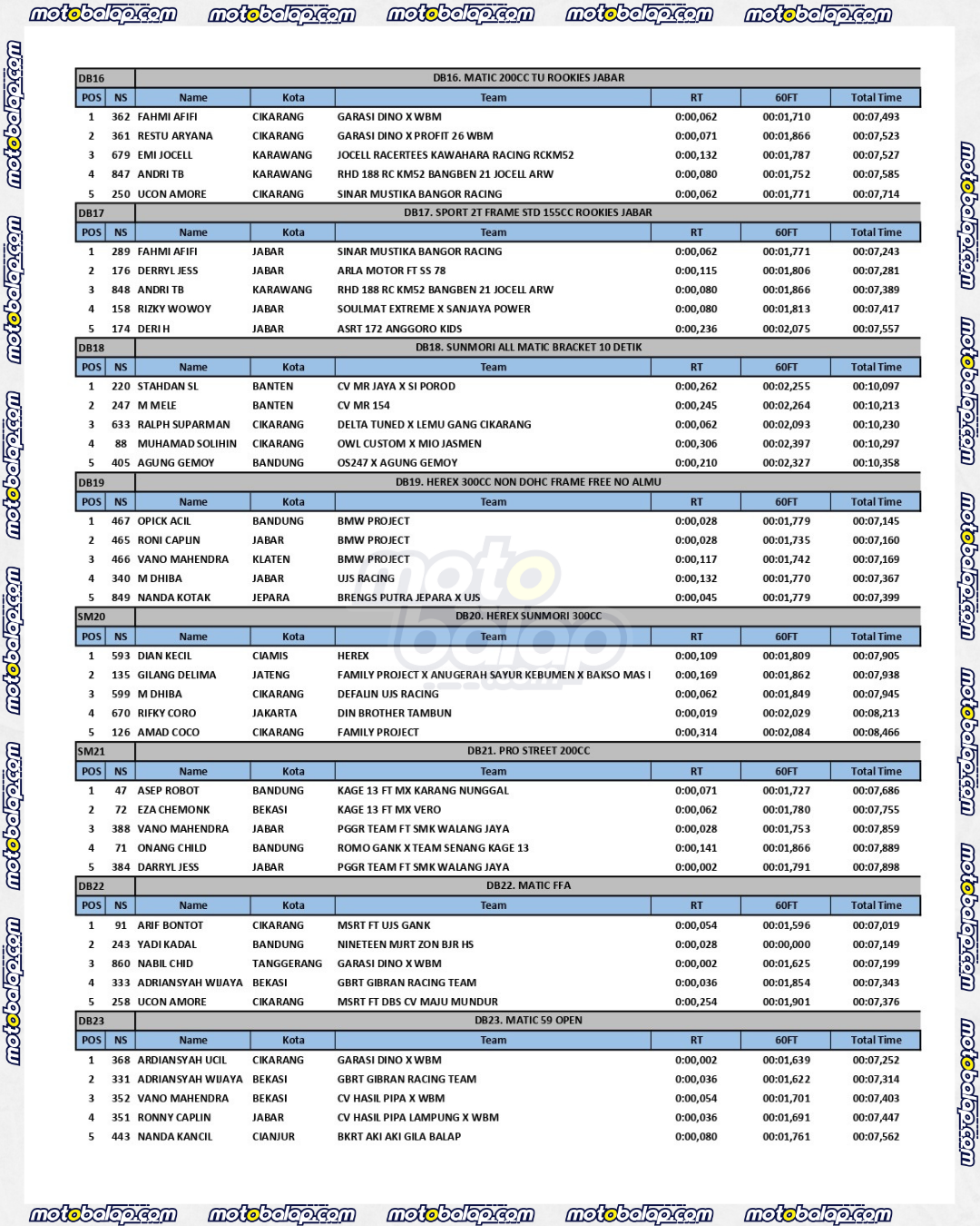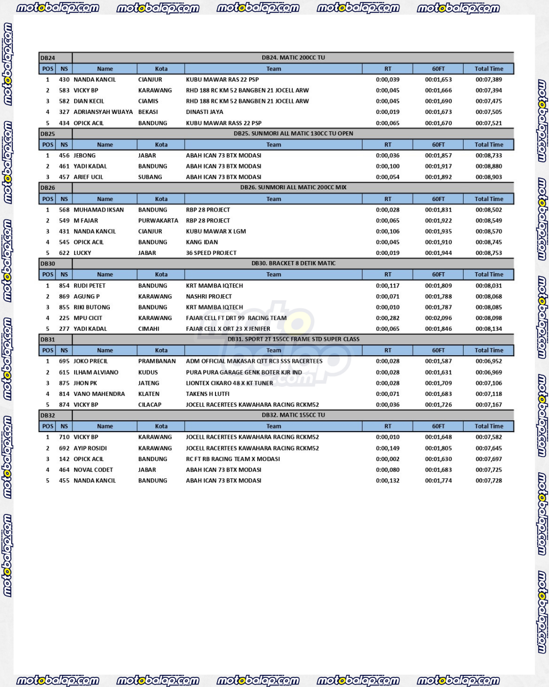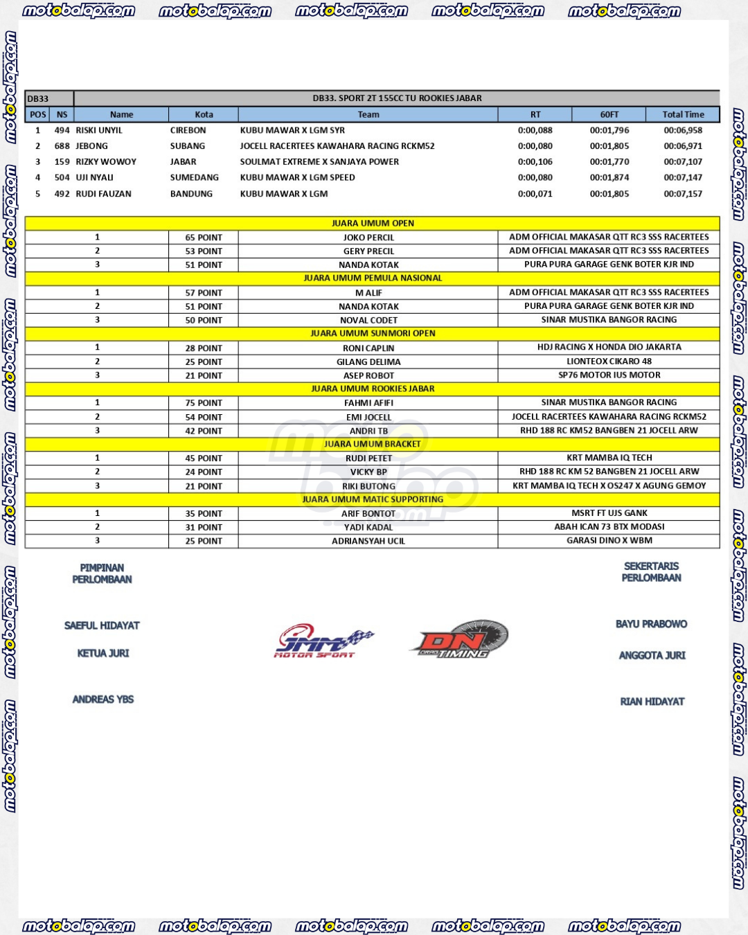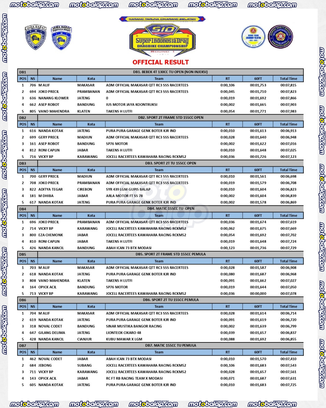 Dari seluruh kelas yang dilombakan, Lihat Hasil Super Indonesia Drag (SID) Dragbike Championship 2025 Round 1 adalah sebagai berikut: