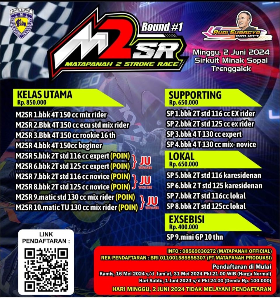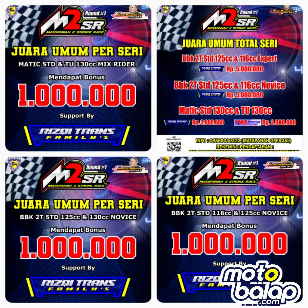“Untuk kategori kelas poin ada bebek dua tak 116 cc dan juga 125 cc pemula dan expert, sedangkan untuk menambah keseruan event M2SR tahun ini kita juga akan membuka kelas poin untuk matic yaitu 130 cc std dan tune up open,” Ungkap Rudi Subagyo sebagai penyelenggara.