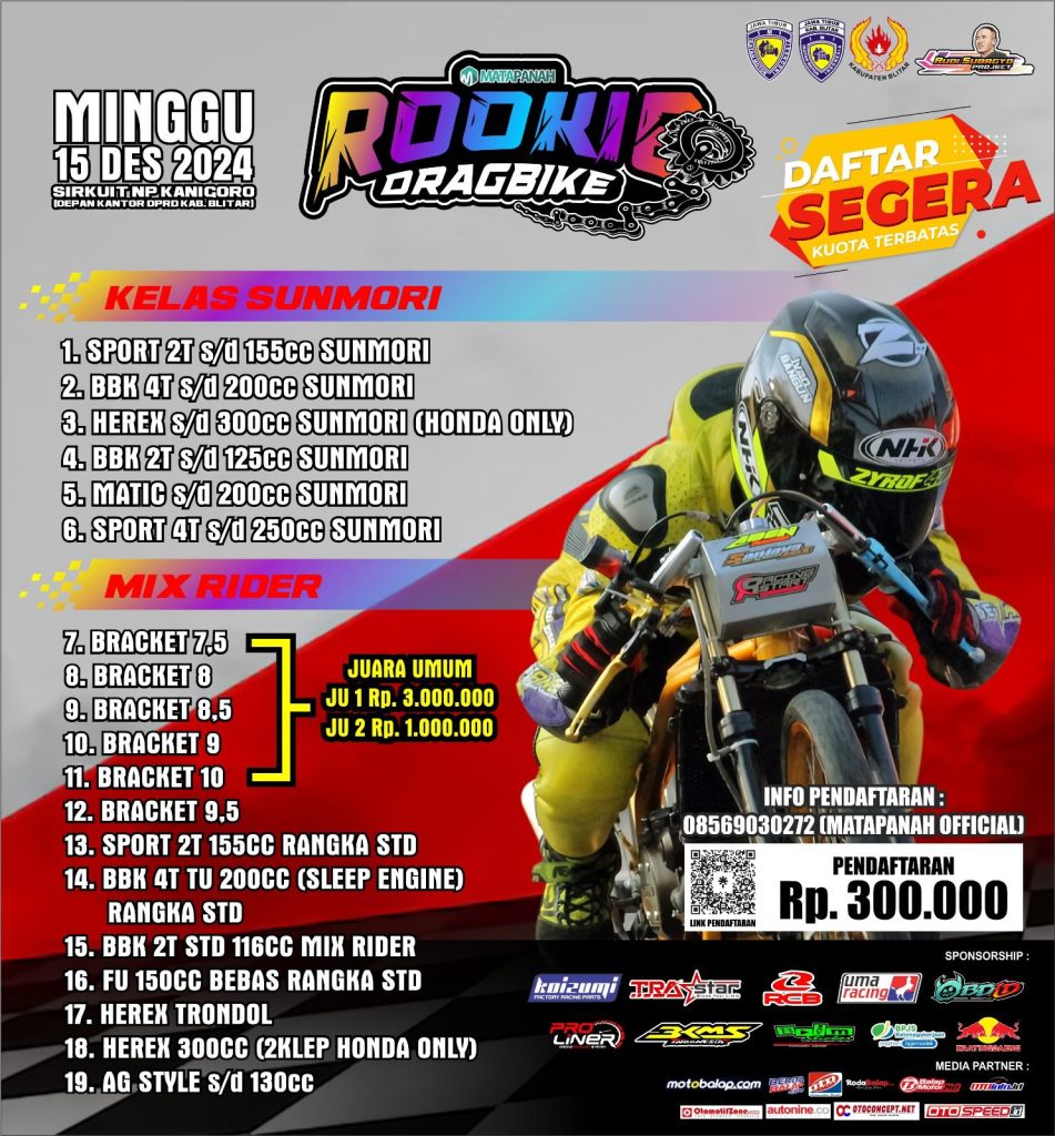 MOTOBALAP.COM – Matapanah production bersiap menggelar kembali agendanya untuk pecinta balap lurus 201 meter, adalah Rookie Drag Bike yang akhir pekan ini akan terselenggara di Kabupaten Blitar, Jawa Timur (15/12).