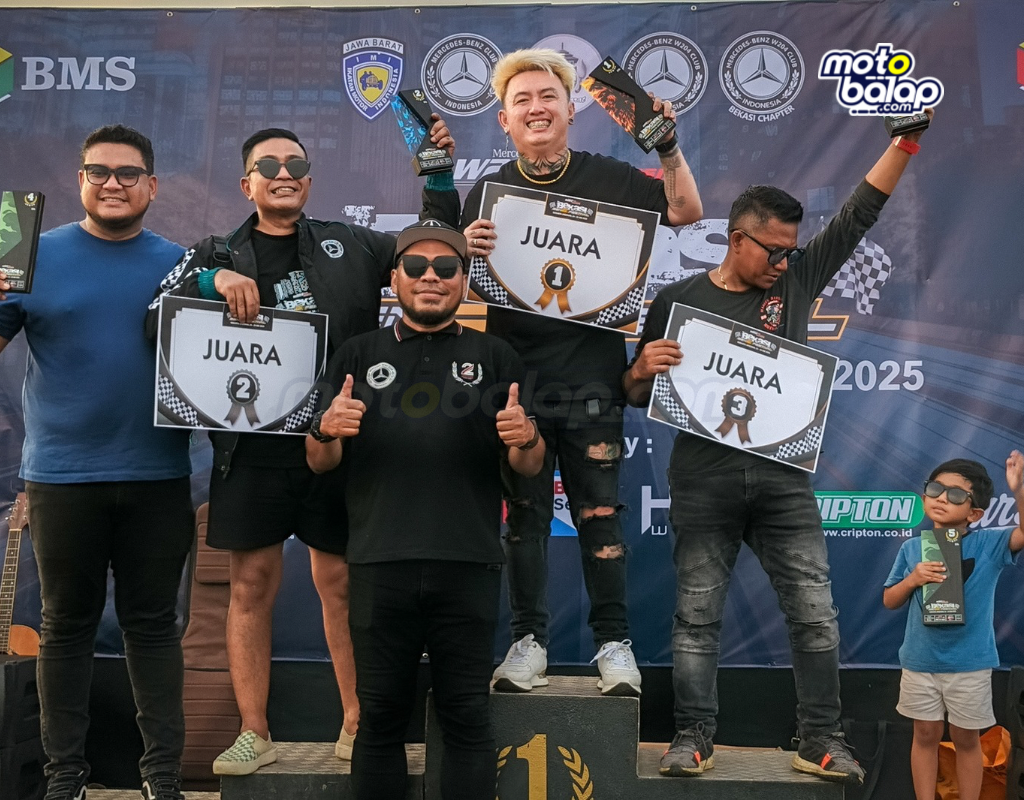Michael Chang di podium 1 kelas komunitas khusus mobil Mercedes pada gelaran Bekasi Benz Festival 2025. Foto Motobalap.com | Nunu.