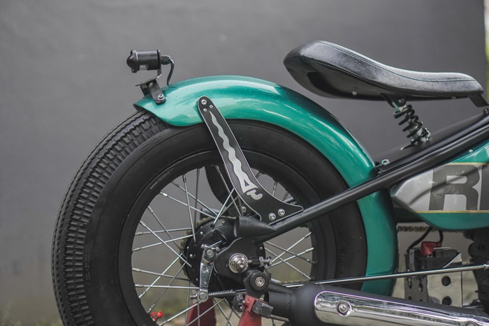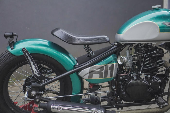 Lanjut ujarnya, “kalau untuk ubahan saya coba konsep baru bergenre Bobber, kami tambahkan suspensi di bawah jok, supaya nyaman saat Bapak kendarai.”