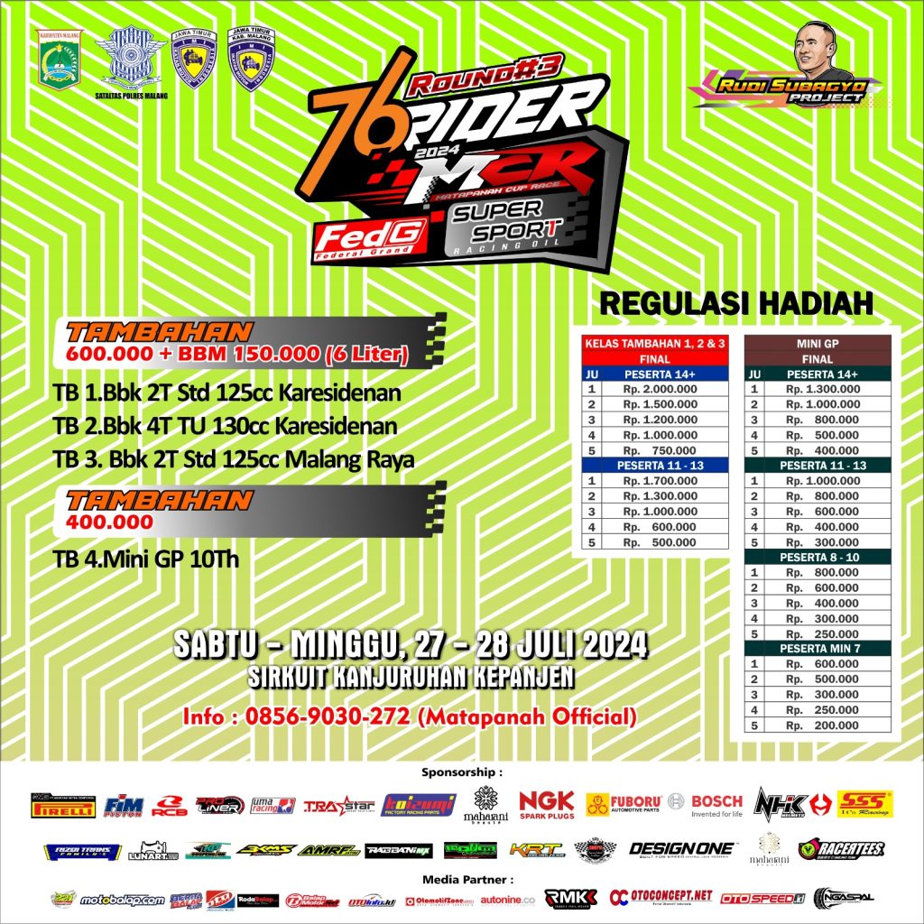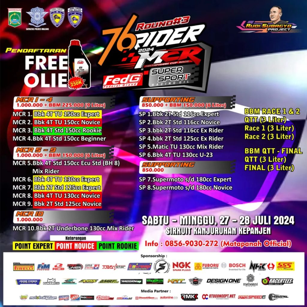 MOTOBALAP.COM- Tidak terasa Matapanah cup race (MCR) tahun ini akan segera memasuki babak ke tiga / seri 3. Untuk lokasinya sendiri akan kembali mengunakan halaman luar sirkuit NP. Stadion Kepanjen Kabupaten Malang (27-28 Juli 2024).
