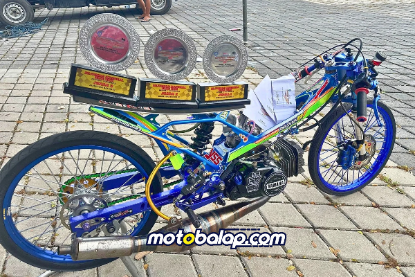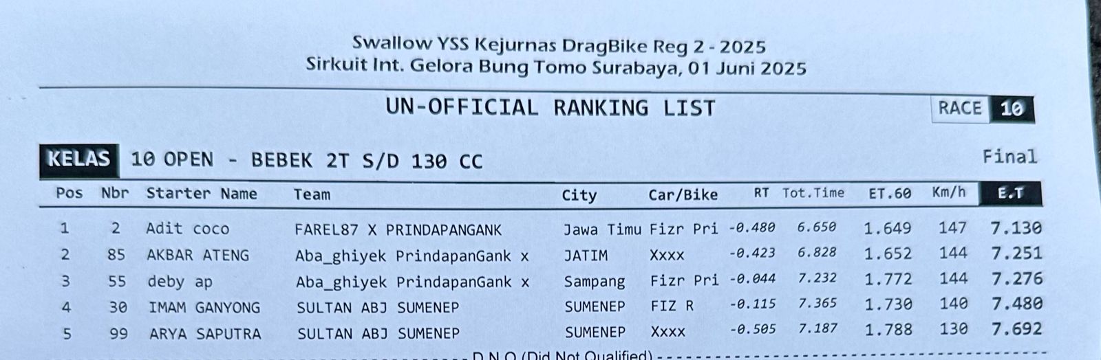 Dengan motor anyar dan sosok bos baru, Farel AP, tim ini langsung menunjukkan taringnya di kelas bebek 2 Tak 130 TU Open. Tak main-main, motor dengan basic Yamaha F1ZR garapan tuner muda Gufron EF berhasil memecahkan rekor dengan torehan waktu fantastis 7.130 detik!