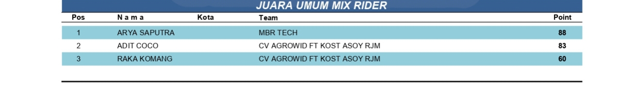 Nah untuk Juara Umum sendiri di raih oleh Arya Saputra, pada kategori Mix Rider dengan torehan 88 poin, unggul tipis dari lawan-lawannya.