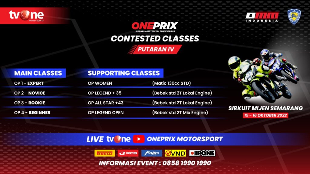 Sementara kelas yang akan digelar yaitu 4 kelas utama, Oneprix 1 atau OP1 (Expert Bebek 150cc Tune Up), Oneprix 2 atau OP2 (Novice Bebek 150cc Tune Up), Oneprix 3 atau OP3 (Rookie Bebek 150cc Standart) dan Oneprix 4 atau OP4 (Ecu Standard). Selain itu juga akan ada kelas supporting, kembalinya kelas Oneprix Legend yang akan diikuti exrider-exrider terbaik tanah air pada masanya, kelas Oneprix legend akan dibagi 3 yaitu Oneprix Legend (U45+ Bebek 2T Std – Exrider Nusantara), Oneprix All Star (U35+ Bebek 2T Std – Exrider Nusantara) dan Oneprix Legend Open (Campuran – Bebek 2T Std Exrider Nusantara). Terakhir, kelas supporting Oneprix Women (Matic 130cc Std – MP7).