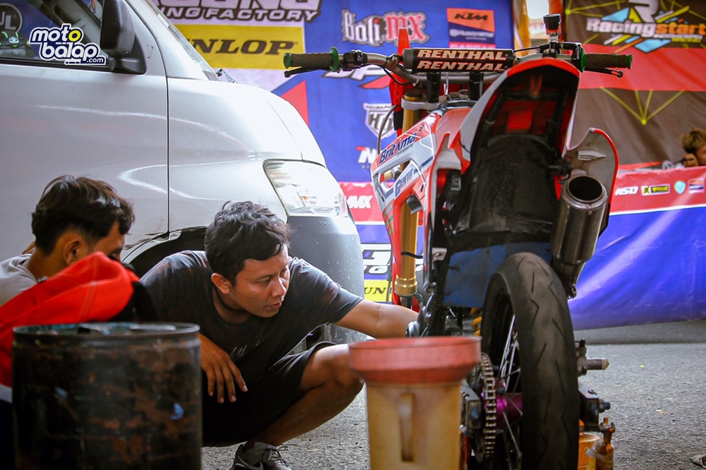“Untuk upgrade Motor Honda CRF milik Sakti Andre spek sama dengan yang lain 175-180 cc sesuai regulasi yang ada, yang unik justru kita pakai eccu standard bawaan dari motor itu sendiri yang hanya kita remap saja. Sedangkan kaki-kaki depan kita pakai ORI juga hanya Upgrade settingan Shock dan belakang kita aplikasi Shock Cr 85, Alhamdulillah dengan upgrade minimalis masih bisa bersaing dengan motor-motor para jawara yang di kelas ini banyak di huni Yamaha WR 155 sampai Husqvarna,” tambah Temin sambil menutup pembicaraan dengan motobalap.com melalui wawancara singkat via phone.