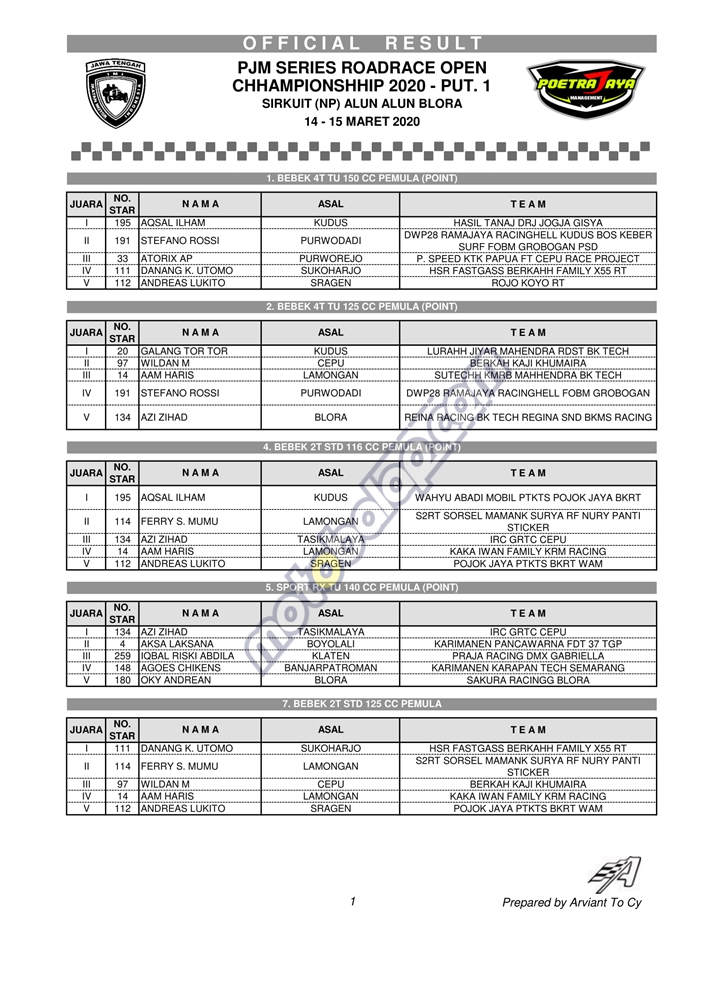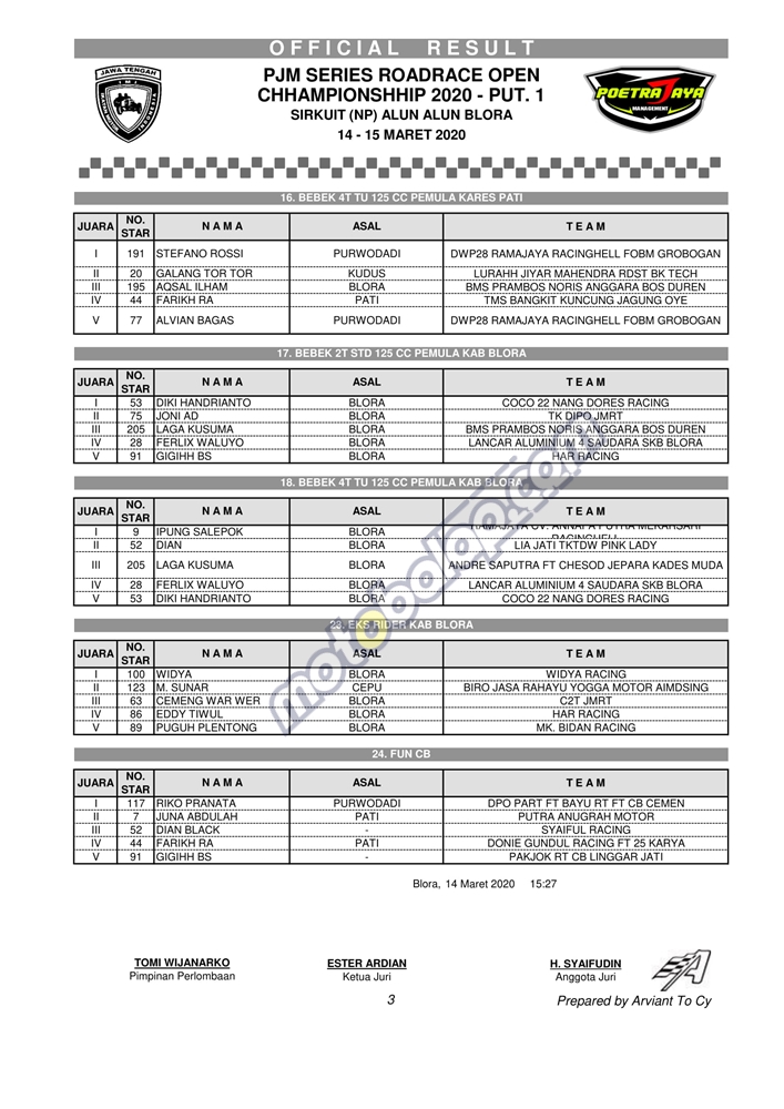 Selamat bagi para pebalap serta team yang berhasil menjuarai Poetra Jaya Road Race Championship Series 2020 seri-1 di sirkuit Alun-alun Blora, Jawa Tengah. (Bayu Jeje)