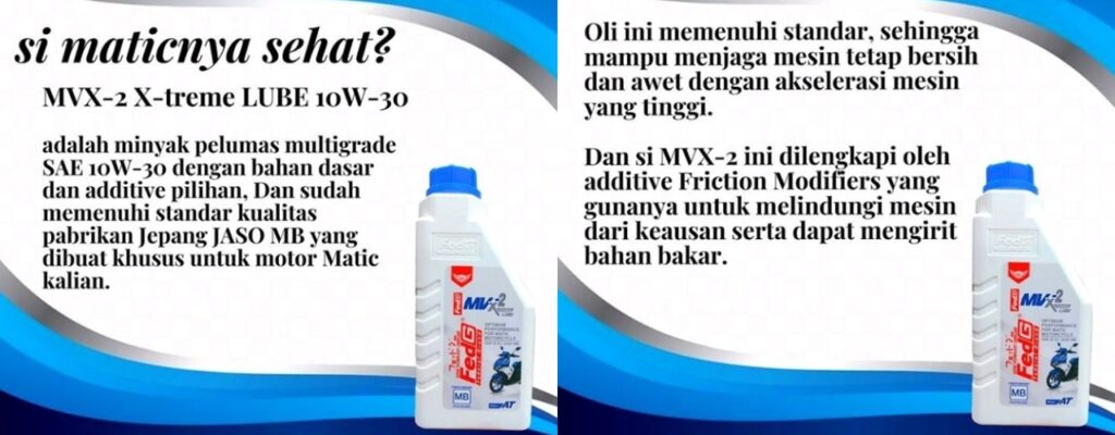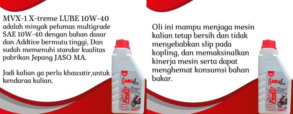 “Untuk Oli Fed G Sendiri ada tiga type diantaranya Fed G Advance, Fed G MV -1 , Fed G MV -2 . Dari segi fungsinya type Fed G Advance di peruntukan untuk motor manual dengan pemakaian. Di atas 5 tahun, untuk kapasitas mesin 110 cc – 200 cc, yang memiliki tingkat kekentalan 20w-50. Fed G MV-1 diperuntukan untuk motor manual dengan pemakaian di bawah 5 tahun. Fed G MV -2 diperuntukan untuk motor matic,” buka Sunjoyo pimpinan PT AMS.