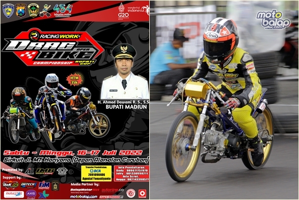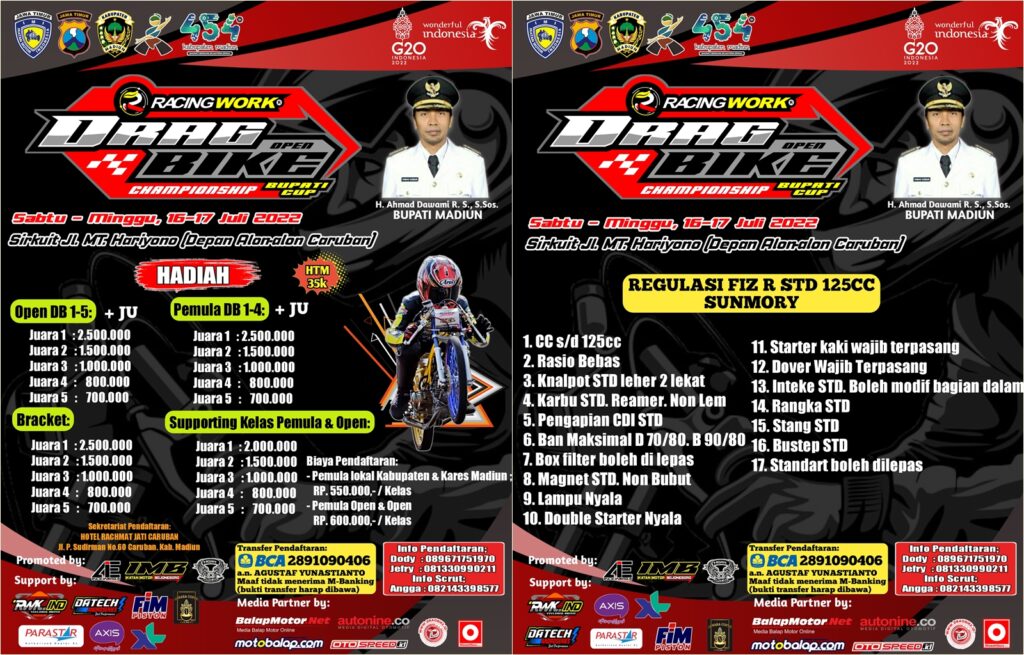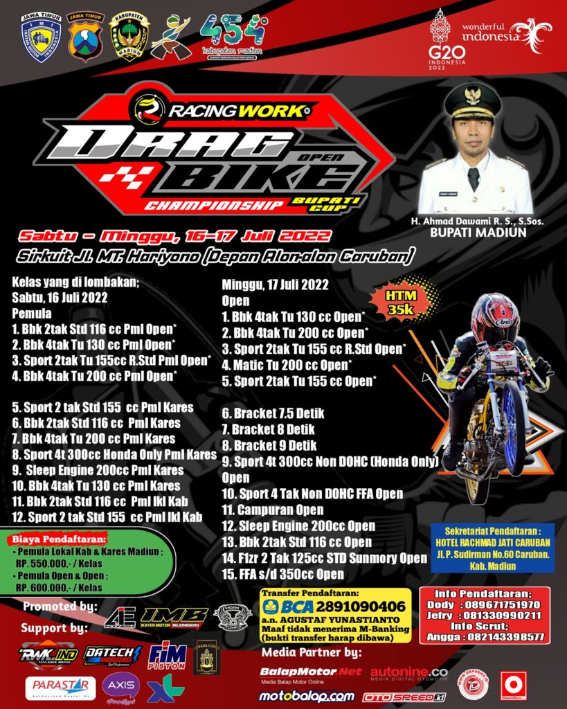 MOTOBALAP.COM – Ajang balap motor lurus 201 meter bertajuk Racing Work Drag Bike Open Championship – Bupati Madiun Cup 2022 siap digelar di Jl.M.T.Haryono (seputaran Alun – alun Caruban). Sabtu-Minggu (16-17/07/2022) akhir pekan ini.