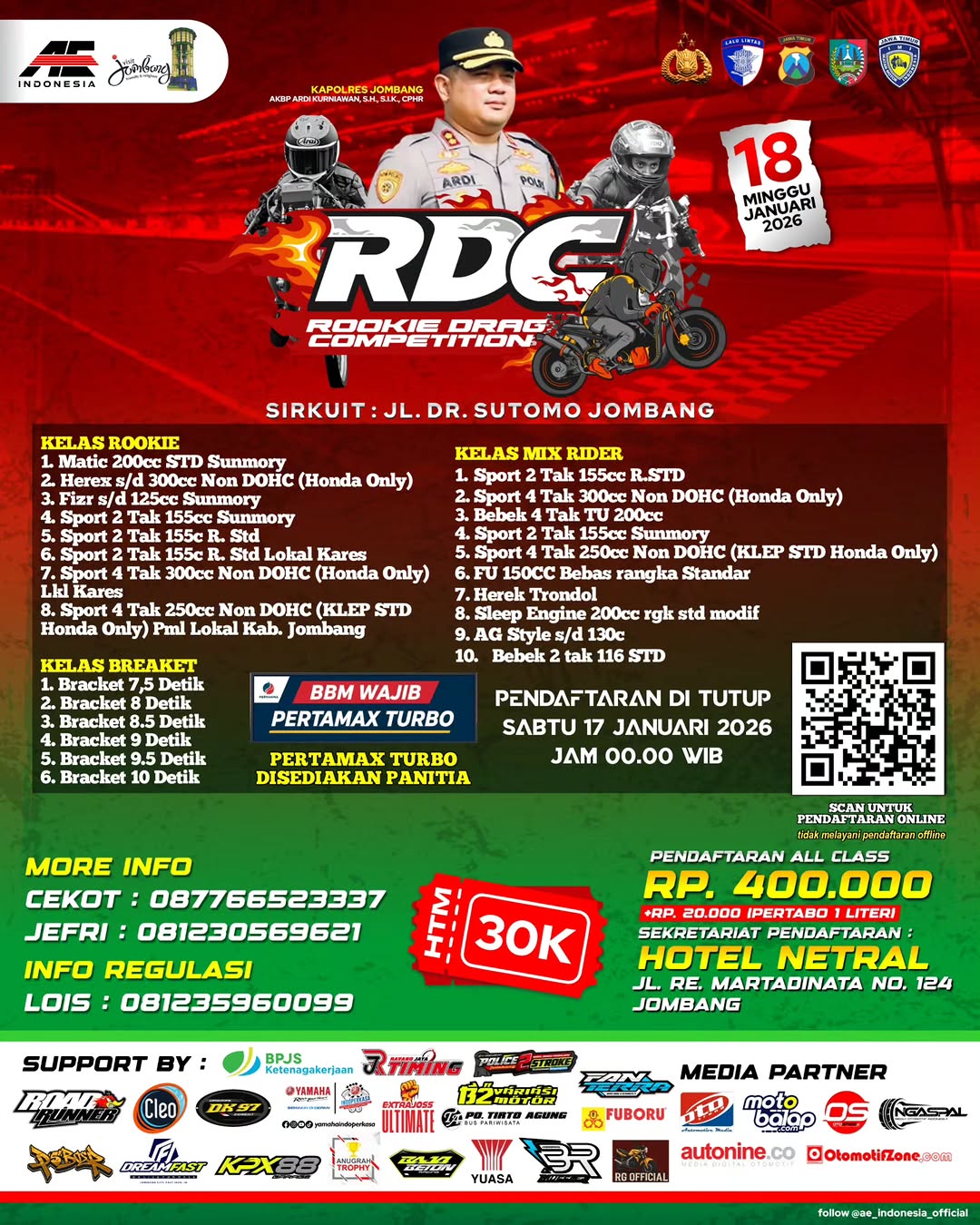 Didukung penuh oleh Polres Jombang di bawah kepemimpinan AKBP Ardi Kurniawan, S.H., S.I.K., CPHR, RDC yang di gawangi oleh AE Indonesia menghadirkan berbagai kelas menarik mulai dari kategori kelas rookie, mix rider, hingga bracket time 7,5–10 detik. Pada event kali ini seluruh peserta diwajibkan menggunakan BBM Pertamax Turbo.