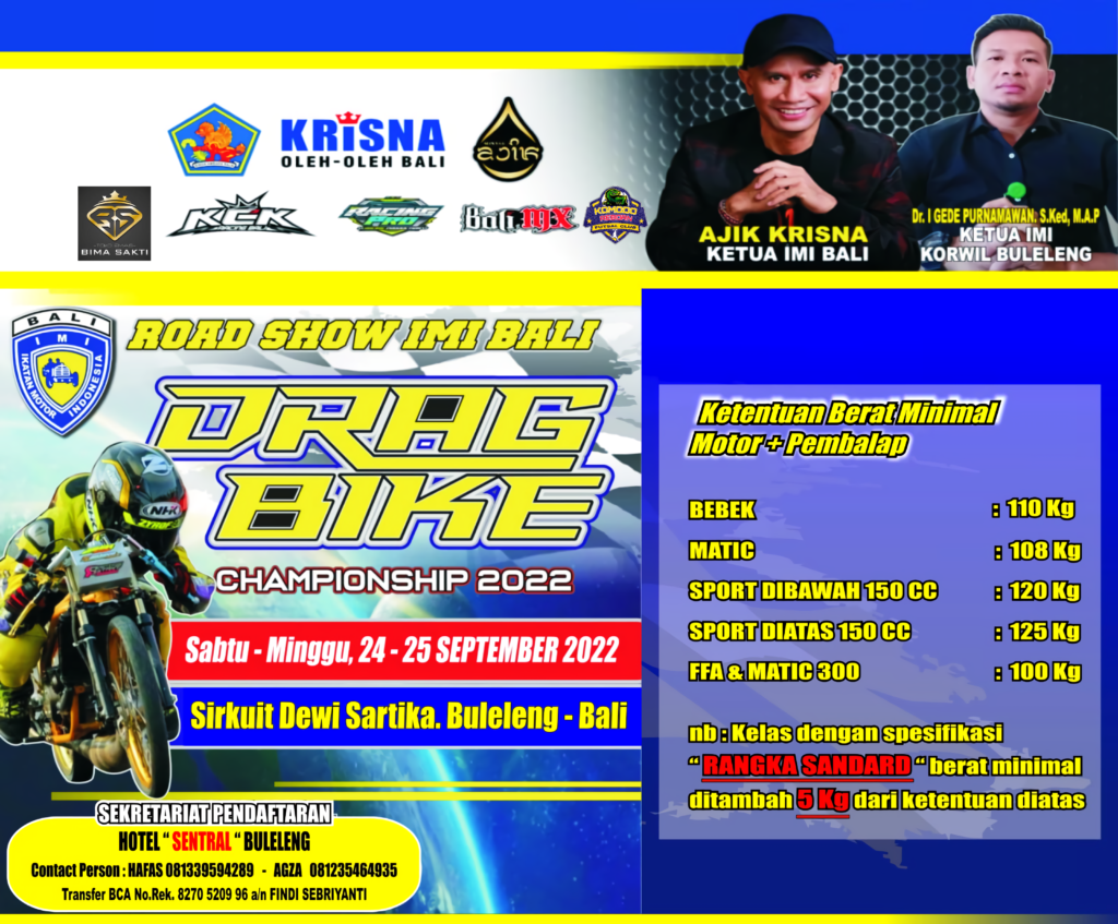 MOTOBALAP.COM – Setelah road race akhir pekan lalu telah berlangsung sukses, kabar gembira kali ini datang dari pihak Korwil IMI Buleleng Bali. Mengingat di Bali sendiri memiliki beberapa Korwil dan saat ini IMI Buleleng yang akan melanjutkan kejuaraan balap motor bertema Road Show IMI Bali Drag Bike Championsip 2022.