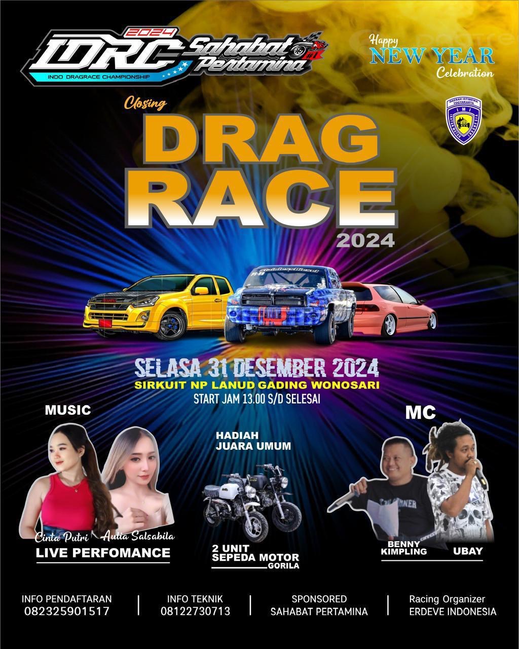 MOTOBALAP.COM – Siapkan mobil terbaik kalian untuk menghadapi IDRC Sahabat Pertamina Closing Dragrace 2024 yang akan berlangsung disirkuit NP Lanud Gading Wonosari Jogjakarta pada penghujung tahun ini alias 31 Desember 2024.