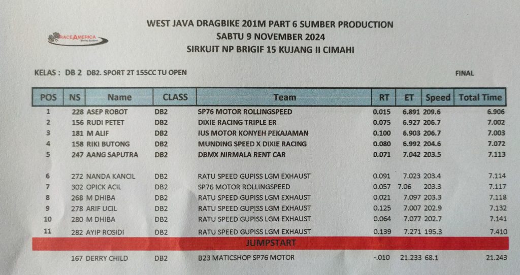 MOTOBALAP.COM – Menjadi pembalap tuan rumah tentu tidak mudah, segala persiapan seperti kendaraan, settingan dan juga mental harus sempurna. Hal ini dilakukan Asep Robot yang harus mempertahankan gelar juara dikelas Sport 2T 155cc TU Open pada gelaran West Java Dragbike 2024 Part 6 yang berlangsung disirkuit NP Brigif 15 Kujang II Cimahi, Sabtu 9 November 2024.