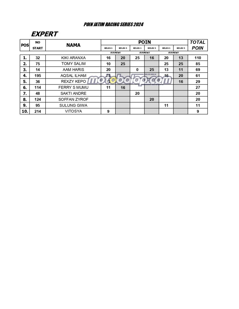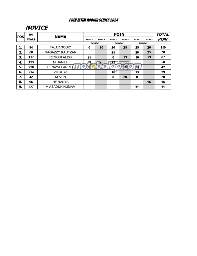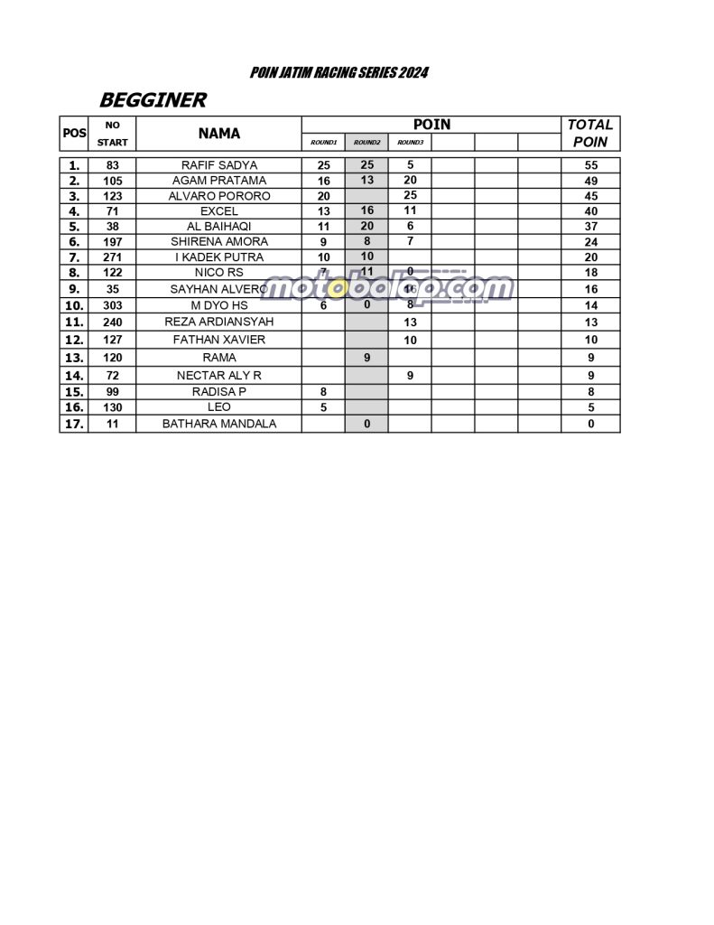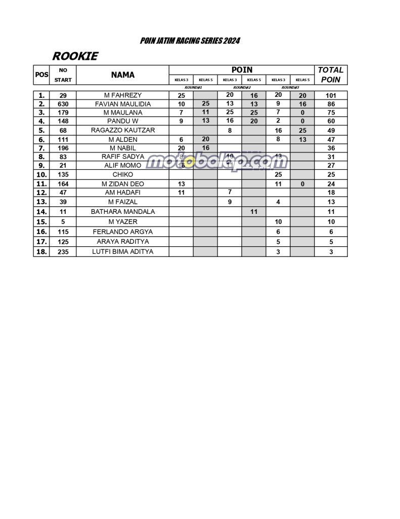 Home Balap Standing Poin Sementara JRS (Kejurprov Jatim) 2024. Balap, Berita, Motor Standing Poin Sementara JRS (Kejurprov Jatim) 2024.Bayu JejeAugust 6, 2024 MOTOBALAP.COM- Berikut adalah Standing Poin Sementara JRS (Kejurprov Jatim) 2024 hingga Seri 3 Tulungagung. BACA JUGA: CV Nadya Mulia Racing Team Gemparkan Final Kejurprov Jatim, Dengan Raihan JU Rookie Serta Raihan Dua Podium Kelas 5tp Novice dan Dua Tak 116 cc! CommentRead AlsoMatapanah Rookie Drag Bike Kanjuruhan Diserbu 702 Starter! Kelas Baru UMA Bracket 8,5 Detik Langsung Curi PerhatianSpectro Racing Part Turut Andil Sukseskan Gelaran Matapanah Rookie Drag Bike Malang 2026!K-Cunk Motor X Wijaya Racing Kediri Sukses Borong Podium di Gelaran Matapanah Rookie Dragbike Malang!Tampilan Baru Ninja 155 Rangka STD Sekar Anom Group Catatkan Podium Pertama di Matapanah Rookie Dragbike Malang!Hasil Kejuaraan Matapanah Rookie Drag Bike 2026 Sirkuit Gor Kanjuruhan MalangSekar Anom Duetkan Joko Percil Serta Deska Anak Langit di Ajang Matapanah Rookie Dragbike Kanjuruhan Malang!