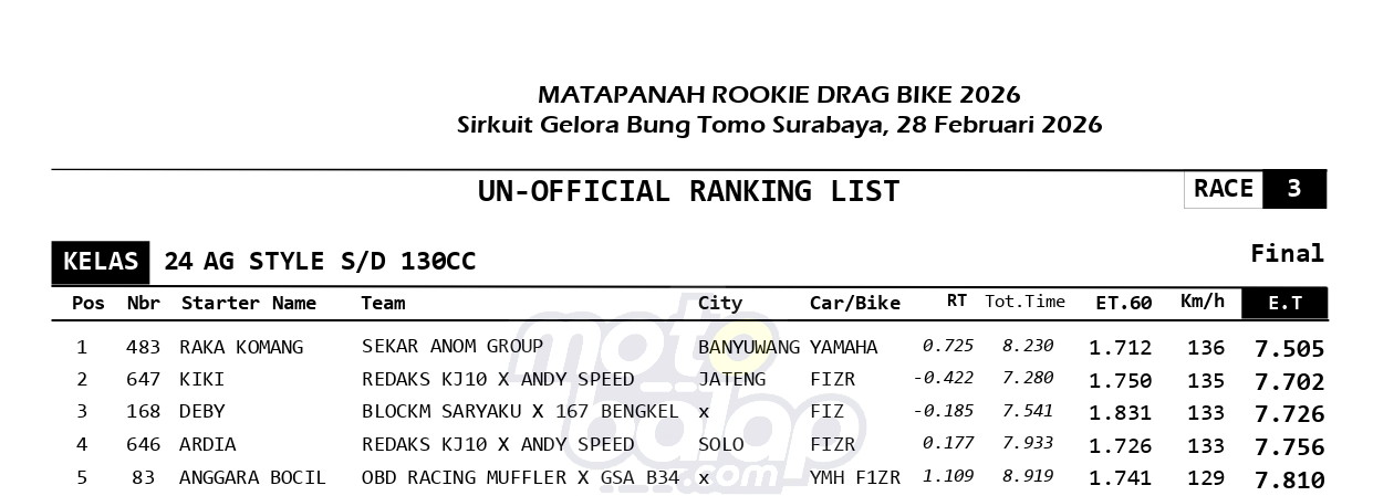 MOTOBALAP.COM – F1ZR AG Style Sekar Anom Group masih konsisten , dan tidak mau turun dari singgasana podium pertama. Hal ini merujuk pada hasil race Ramadhan Night Race Matapanah Rookie Dragbike (28/2), tim milik bos Dio berhasil meraih podium pertama lewat Raka Komang.