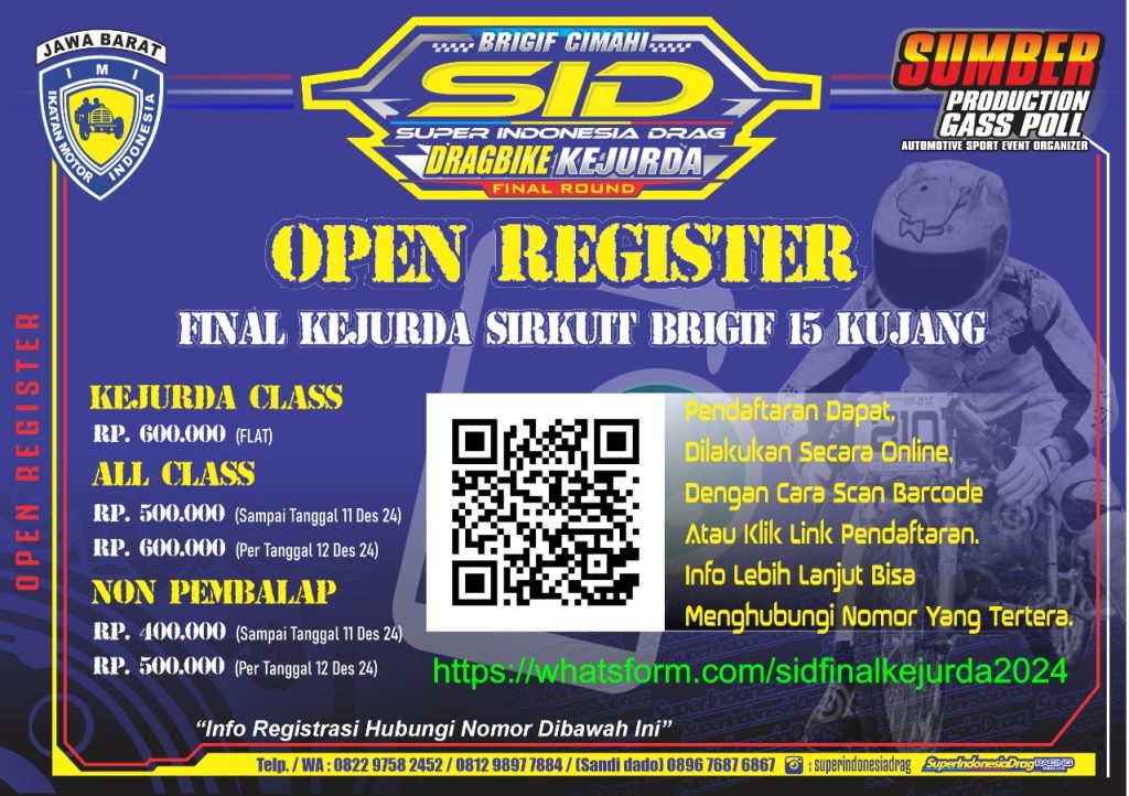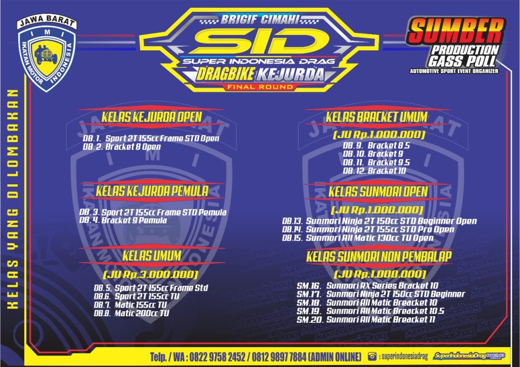 MOTOBALAP.COM – Bersiap semuanya Super Indonesia Drag (SID) Final Kejurda Drag Bike Jabar 2024 bakal dihelat di Cimahi. Edisi terakhir kejurda dragbike IMI Jabar tersebut bakal menjadi perburuan gelar juara, tentunya event ini akan berlangsung disirkuit NP Brigif 15 Kujang II, Cimahi 14 Desember mendatang.