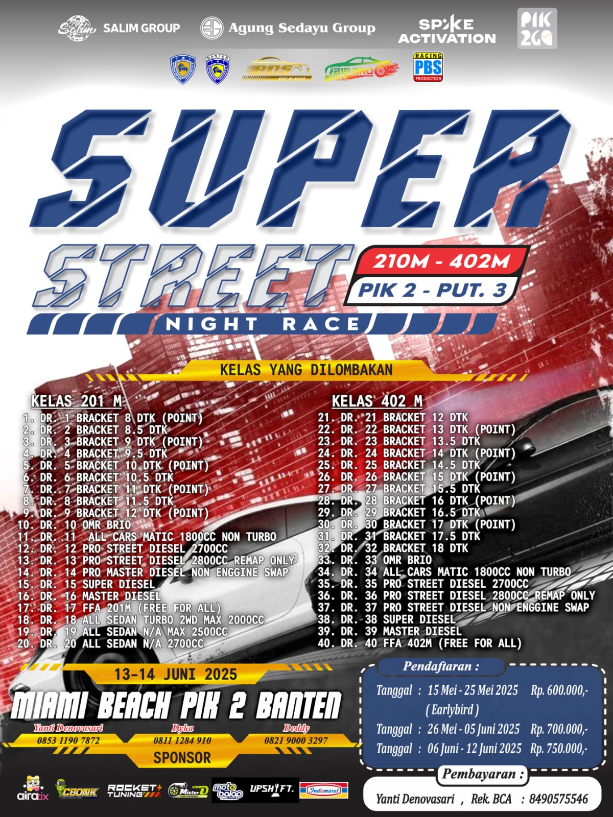 MOTOBALAP.com – Gelaran bergengsi Super Street Night Race 201m 402m Putaran 3 siap dihelat 13-14 Juni mendatang di sirkuit NP Miami Beach Pantai Indah Kapuk 2 Banten.  Event garapan Best Of Speed (BOS) ini bakal menyuguhkan aksi fantastis dari para jagoan drag race tanah air.