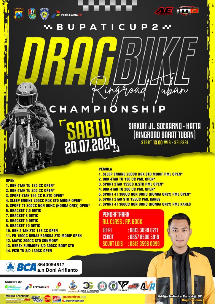 “Kami tetap optimis gelaran kali ini bisa berjalan seru dan berkualitas, tentunya perlu upaya dan dukungan dari kalian semua nih para pengemar dan pecinta drag bike khususnya Tuban, Jawa Timur dan Sekitarnya untuk meramaikan event kami ini,” ungkap Lana AE Indonesia.