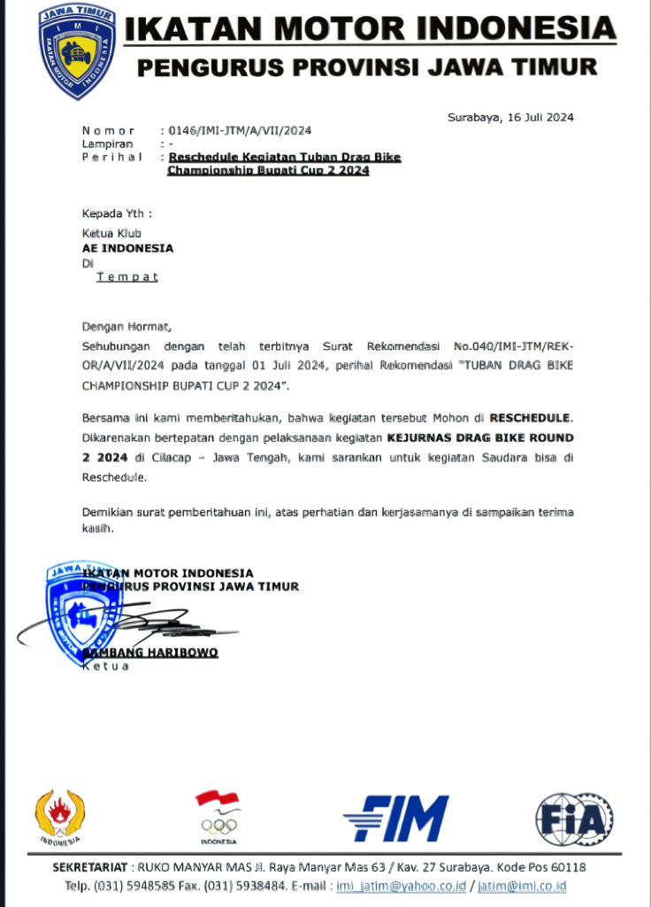 MOTOBALAP.COM- Keputusan diambil hari ini (16/7) dengan keluarnya surat dari IMI Jatim yang menyatakan bahwa, kegiatan Bupati Cup 2 Drag Bike Tuban Championship berbeturan dengan jadwal Kejurnas drag bike di Cilacap Jateng.
