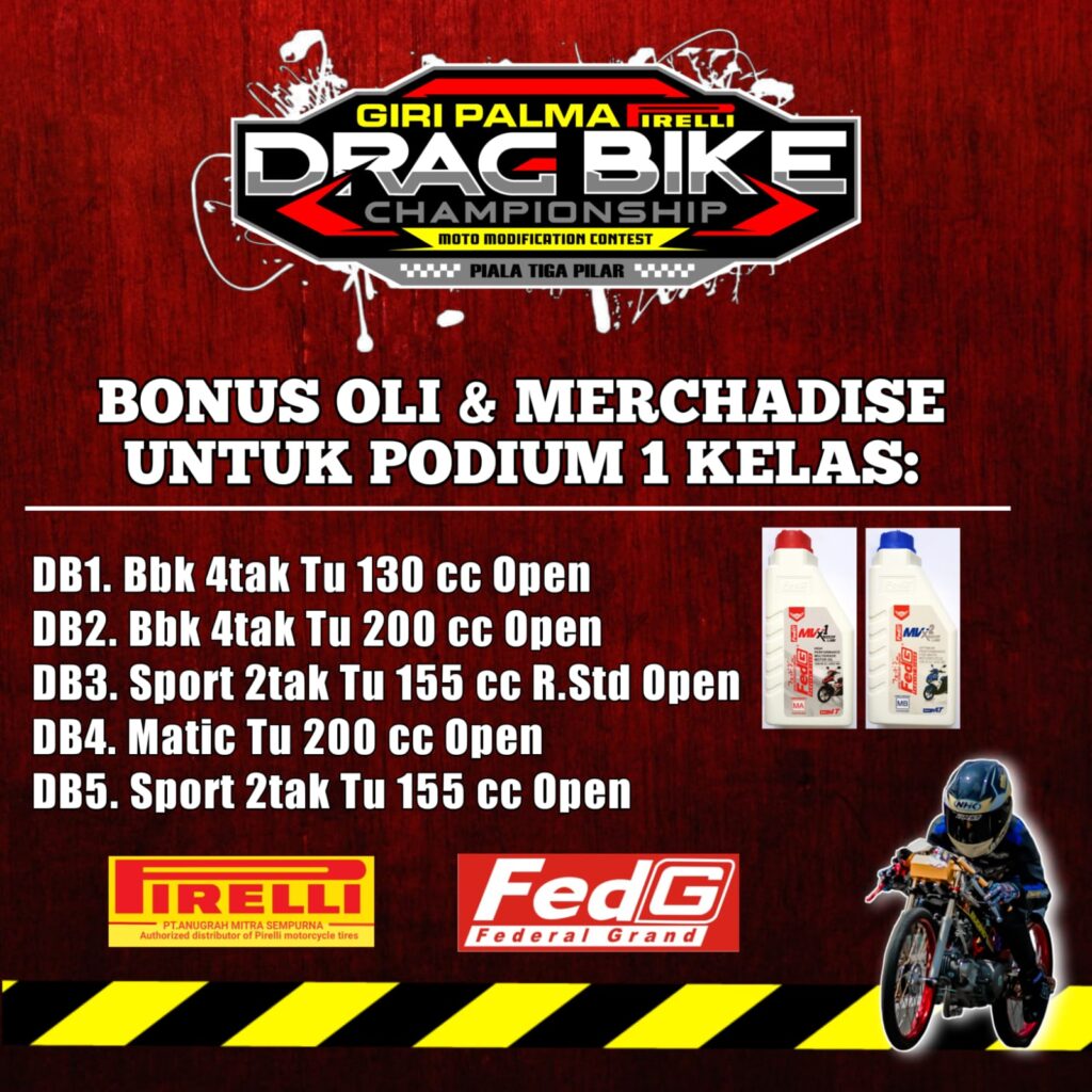 “Untuk bonus produk dari Fed G Oil nantinya kami berikan untuk juara 1 pada kelas DB 1 ( bebek 4 Tak TU 130 cc open), DB2 ( bebek 4 Tak TU 200 cc open), DB 3 ( Sport 2 Tak TU 155 cc Rangka Std Open), DB 4 ( Matic TU 200 cc Open), Dan DB 5. ( Sport 2 Tak TU 155 cc Open ),” bilang Maulana Surindra AE Indonesia Racing Organizer.