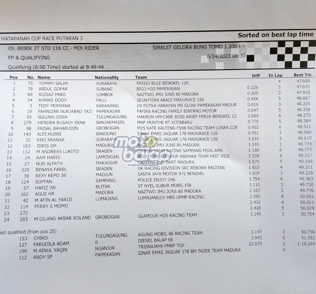Di bawah ini merupakan hasil QTT Bebek 116cc Mix Rider MCR seri 3 di sirkuit Gelora Bung Tomo adalah sebagai berikut: