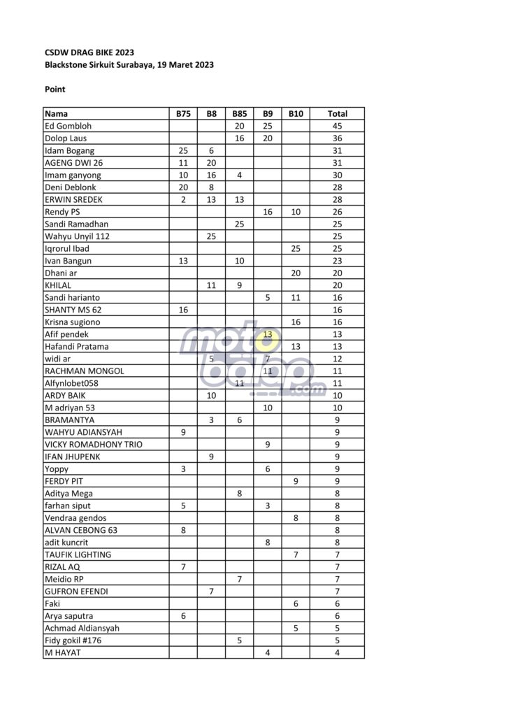 Dari kesulurahn kelas yang dilombakan, di bawah ini merupakan Total poin CSDW Drag Bike 2023 adalah sebagai berikut: