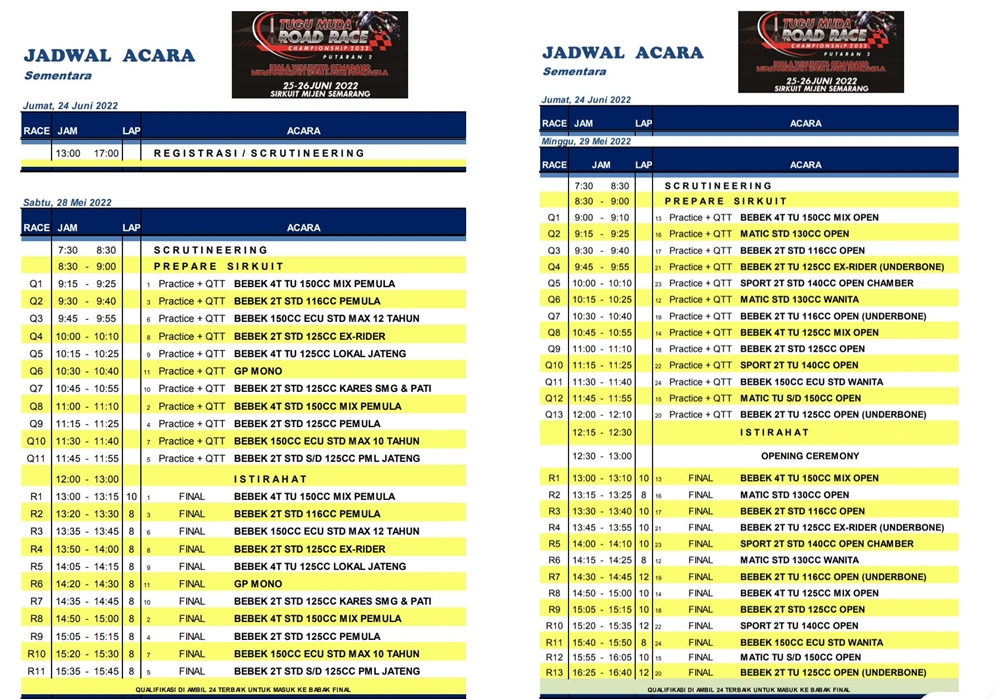 “Mohon diperhatikan jadwal acara Tugu Muda Road Race Championship putaran kedua. Apabila ada perubahan akan segara kami informasikan lagi,” jelas salah satu pihak dari Indeil Racing Organazer.