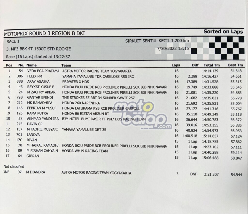 Berikut hasil race 1 kategori Rookie, Kejurnas Motoprix Region B Putaran 3: