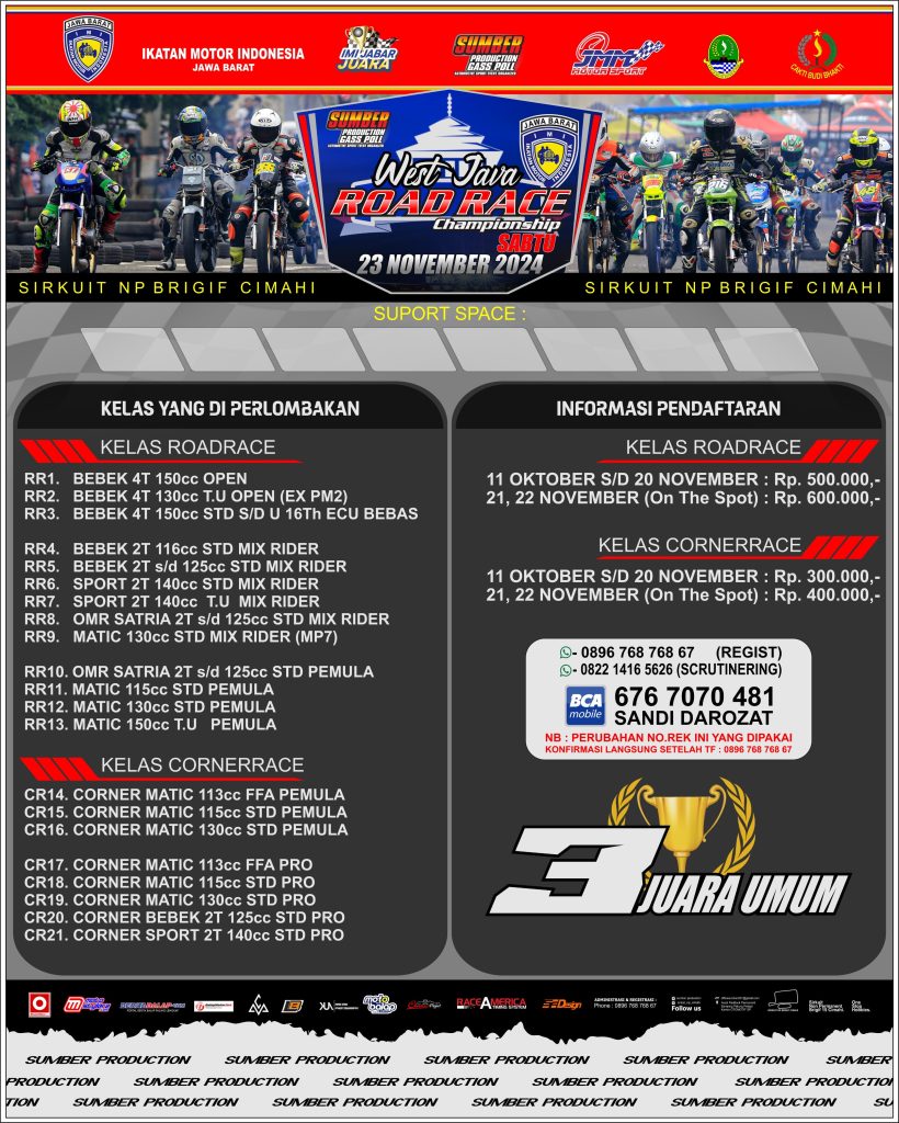 Untuk informasi dan pendaftaran bisa melihat flyer yang tertera di artikel ini. So, jangan sampai terlewat event West Java Roadrace Championship 2024 pada tanggal 23 November nanti.
