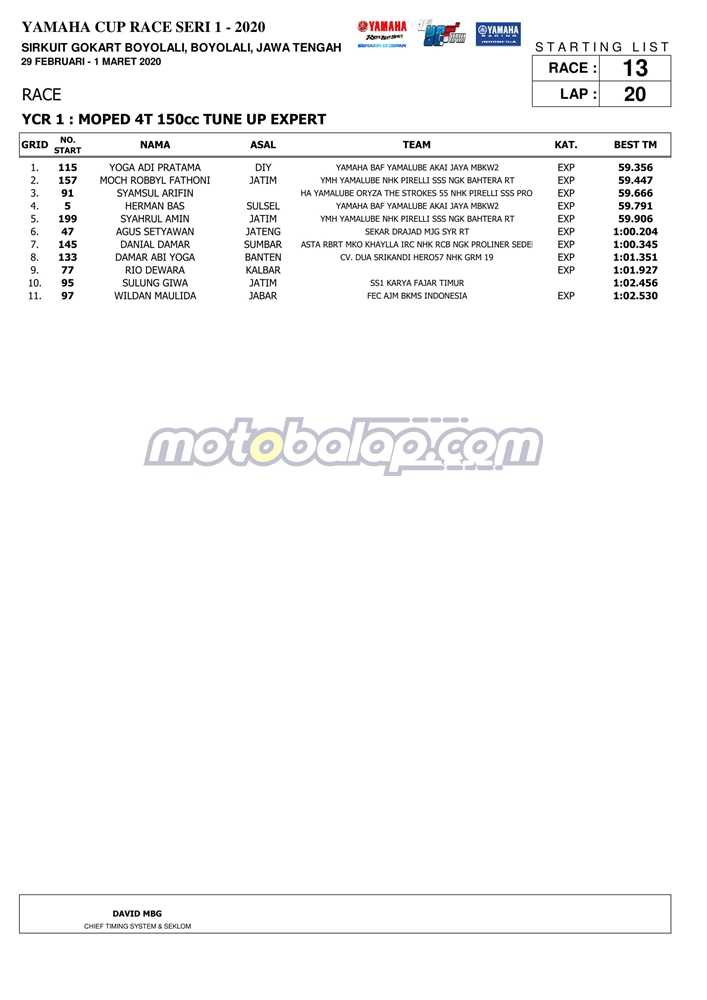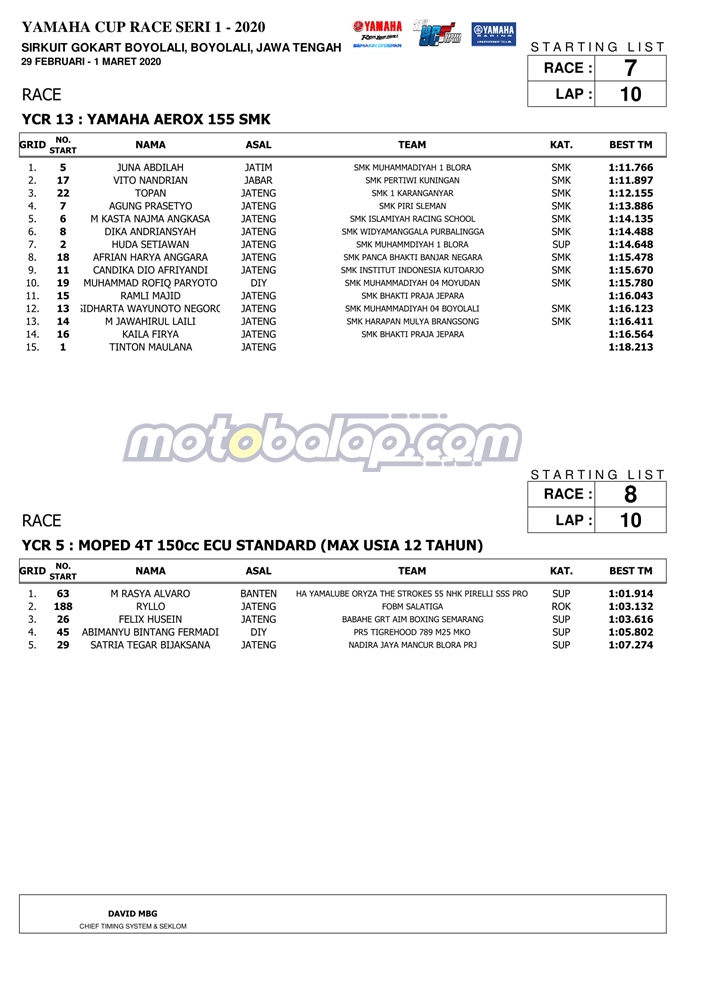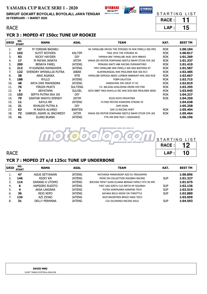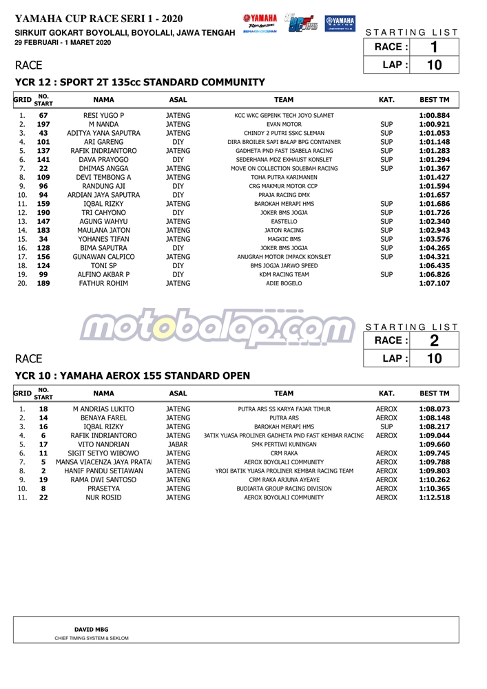 Berbicara mengenai catatan waktu terbaik dari ke-13 kelas yang diperlombakan maka, kami sertakan data berupa hasil kualifaski Yamaha Cup Race seri 1 yang dihelat di sirkuit Gokar, Boyolali: