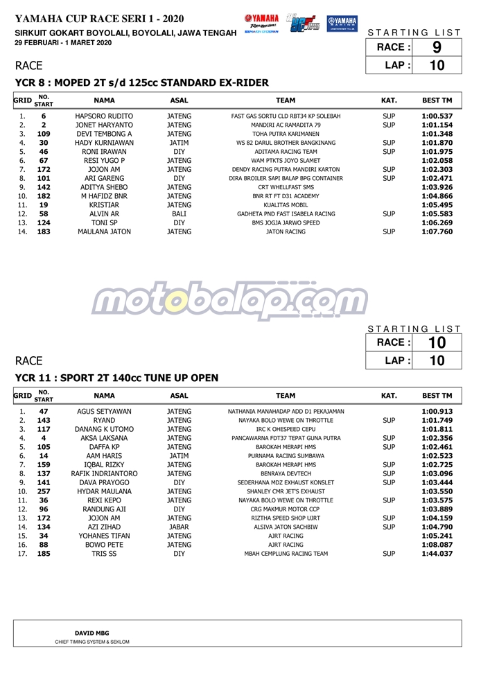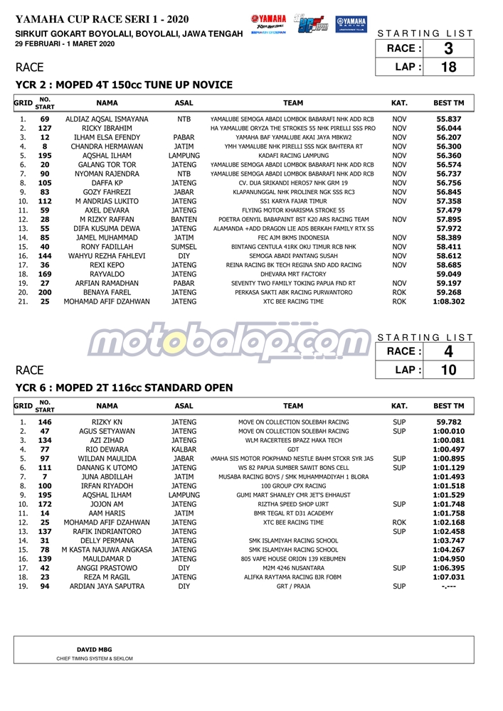 Motobalap.com, Yamaha Cup Race 2020 Boyolali – Ajang balap bertajuk Yamaha Cup Race (YCR) seri perdana 2020 berlangsung spektakuler di sirkuit Gokart, Boyolali, Jawa Tengah (29/02–1/03/2020) dengan diawali dengan babak kualifikasi untuk penentuan grid star menuju babak final.